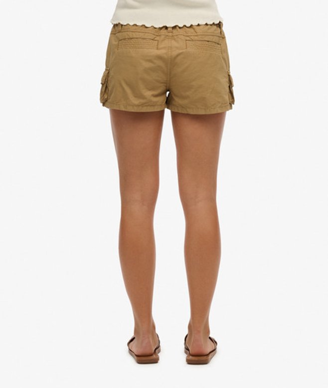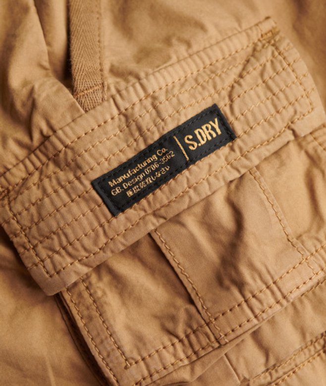 Kies je gebruikelijke maat Halfhoge taille Elastische tailleband Riemlussen Knoop- en ritssluiting Twee zijzakken Twee cargo-zijzakken Twee achterzakken Superdry-patch