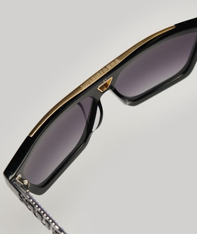 ISO 7000-2950 UV400-lenzen Subtiel geëtst logo op de glazen Pootjes met merklogo Opbergzakje met trekkoord Geschenkdoos Deze bril bestaat voor meer dan 50% uit biobased acetaat Glanzend zwart montuur met een goudkleurig metalen inzetstuk en ontspiegelde glazen met kleurverloop.