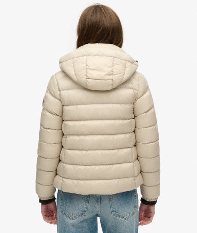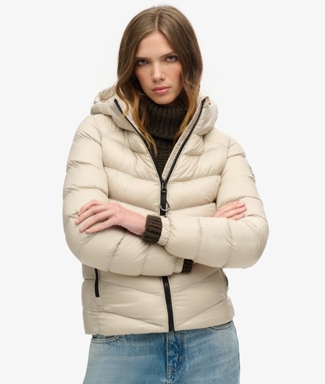 Ga voor een stijlvolle laagjesoutfit met onze gewatteerde Fuji-jas met capuchon.