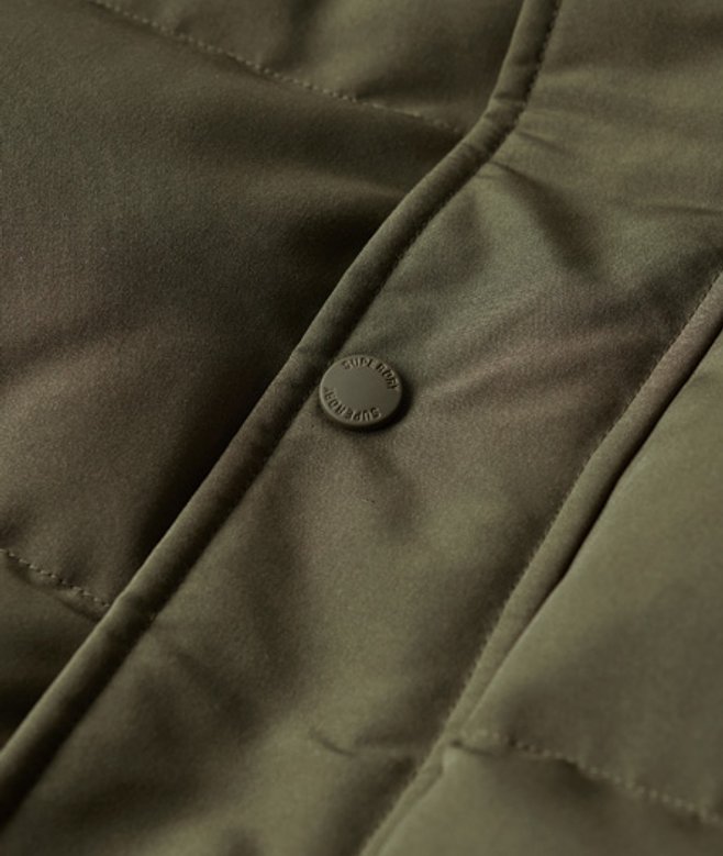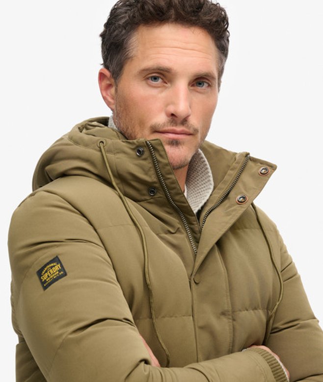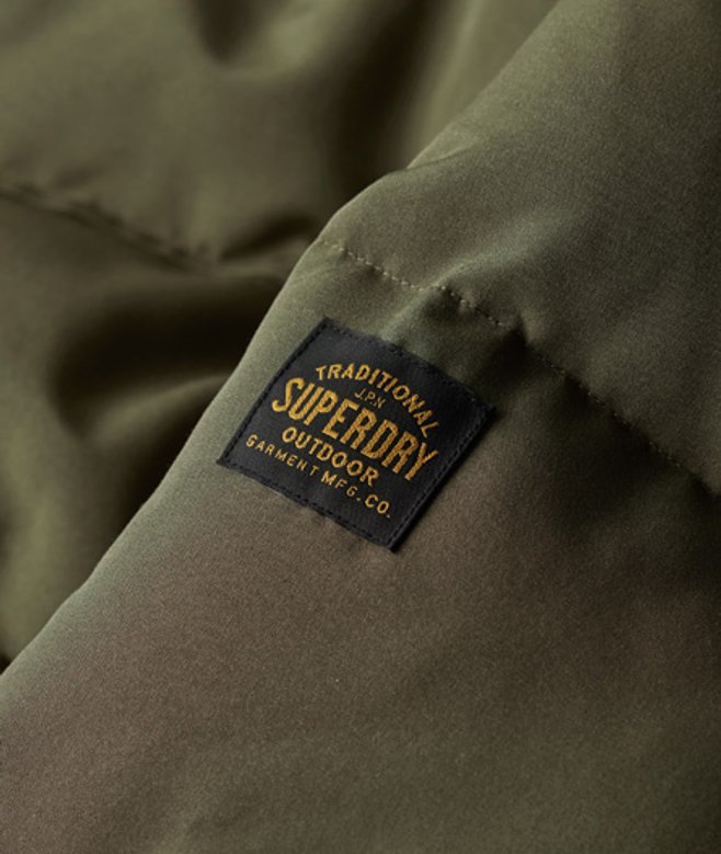 Kies je gebruikelijke maat Doorgestikt ontwerp Gewatteerde capuchon met trekkoord Rits- en drukknoopsluiting Twee zakken met rits Geribde mouwboorden Volledig gevoerd Gewatteerde binnenkraag Superdry-patch op de rechtermouw Geborduurd logo op de schouder
