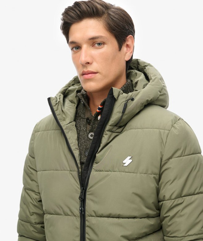 De Sports-pufferjas met capuchon omarmt het iconische ontwerp, waardoor je altijd voor een extra laagje kunt gaan.