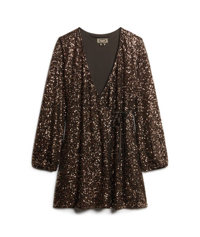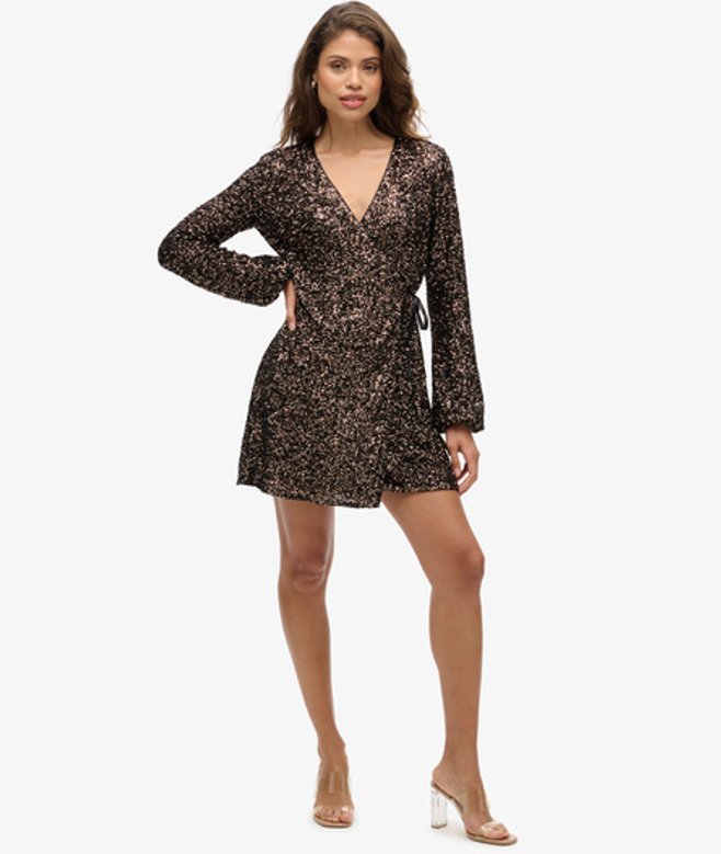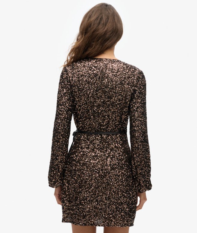 We zijn nog een stapje verder gegaan met onze mini-wikkeljurk met lovertjes en mouwen om je een uniek kledingstuk te geven dat zeker opvalt.