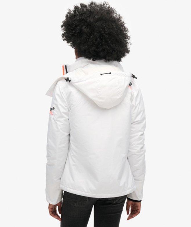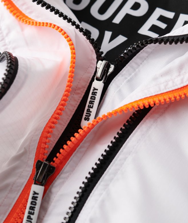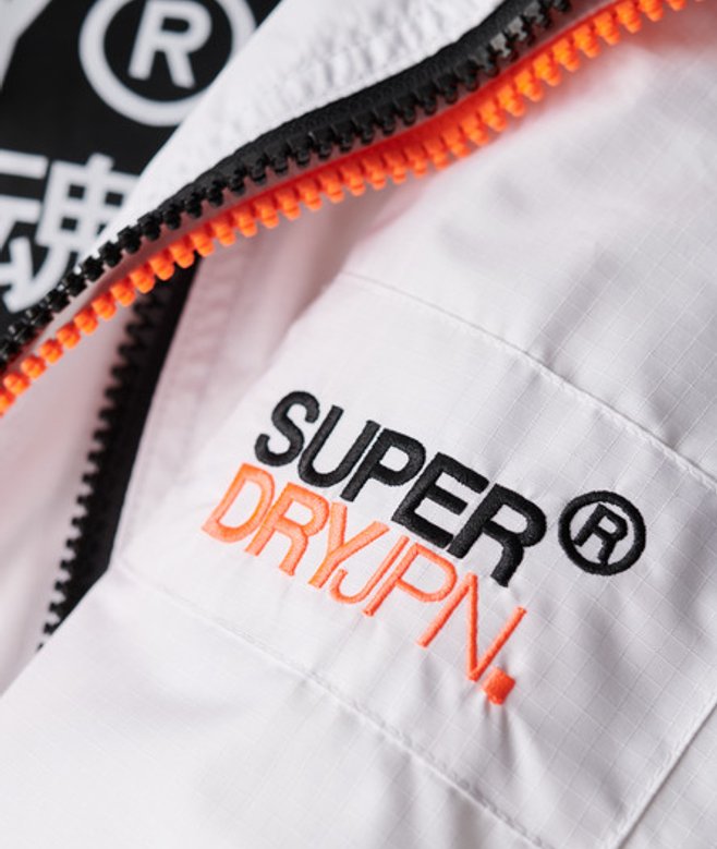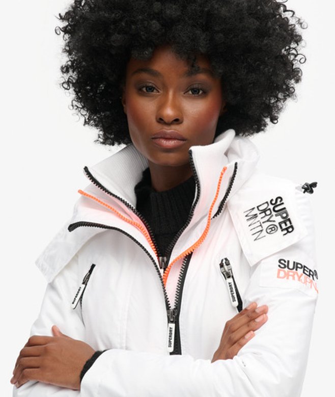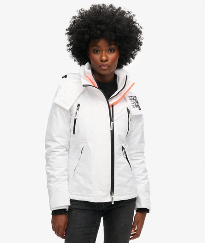 Slimfit - de nauw aansluitende pasvorm zorgt voor een getailleerd silhouet Licht gewatteerde capuchon met elastisch koord met stopper, en klittenbandsluiting met logo op de kraag Geribde kraag aan de binnenzijde Drielagige tweewegritssluiting Vier zakken met rits Geribde mouwboorden aan de binnenzijde Verstelbare zoom met elastisch koord Zachte gewatteerde voering Geborduurde Superdry-logo's Ritstrekkers met merklogo