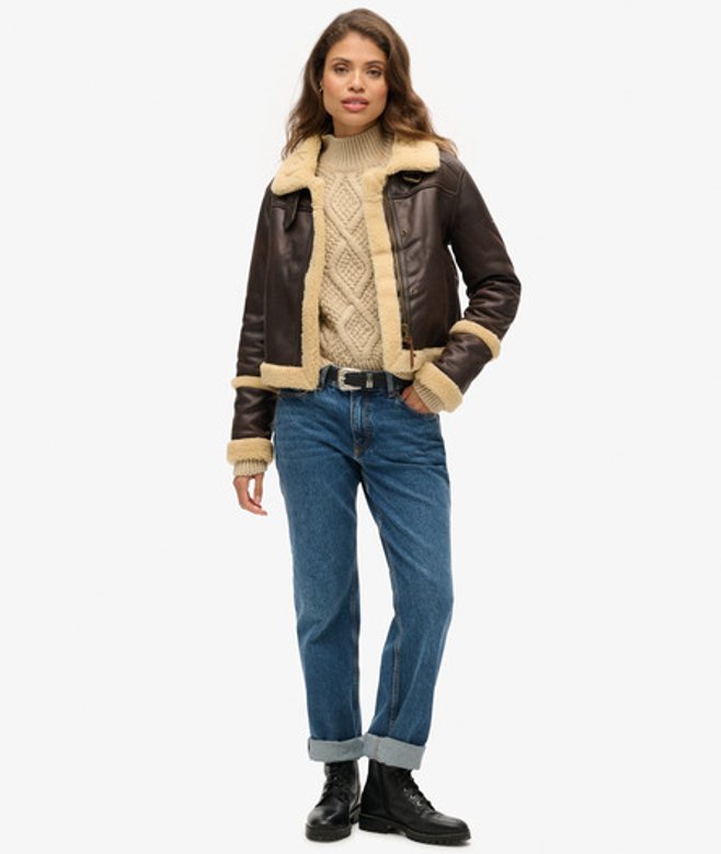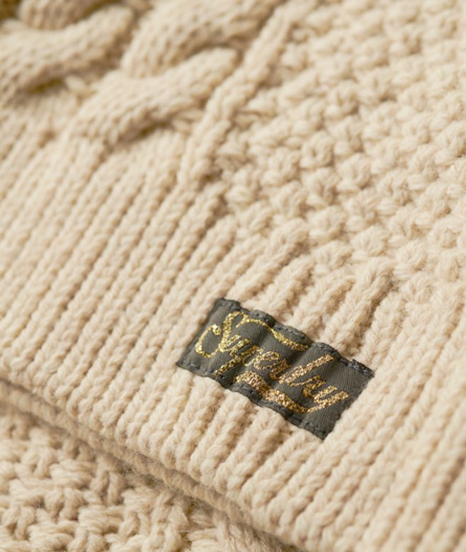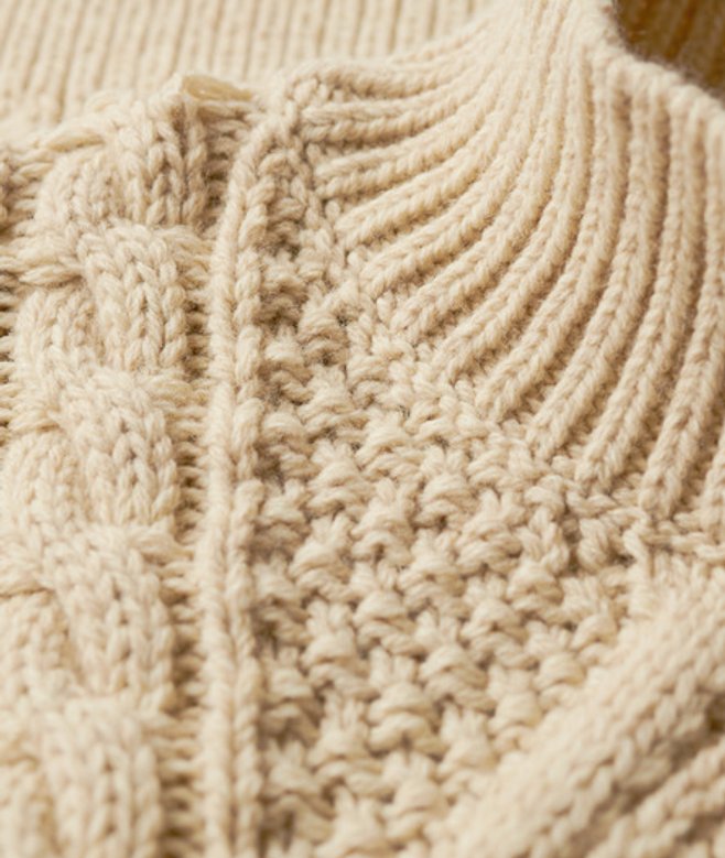 We hebben de klassieke trui gebreid in de Aran-stijl, waardoor een opvallende, chique look ontstaat.