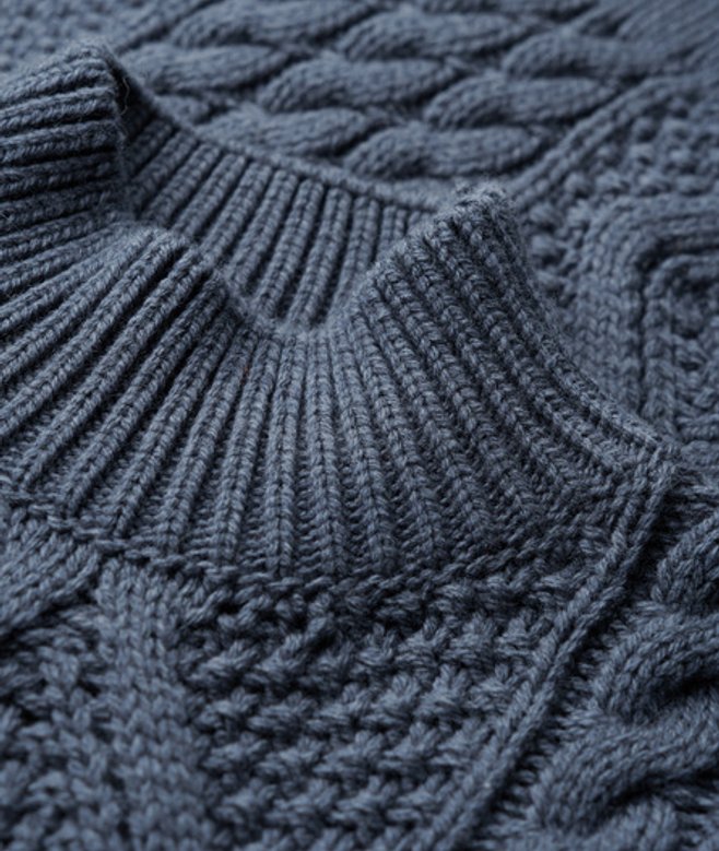 We hebben de klassieke trui gebreid in de Aran-stijl, waardoor een opvallende, chique look ontstaat.