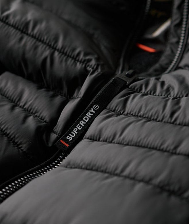 Slimfit - de nauw aansluitende pasvorm zorgt voor een getailleerd figuur Gewatteerd ontwerp Ritssluiting Twee zakken met rits Verstelbaar elastisch trekkoord in de taille Pluche voering aan het centrale deel Binnenzak van mesh Superdry-badge op de mouw