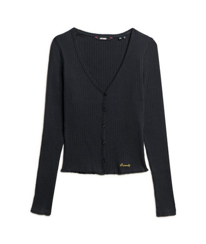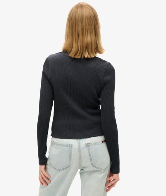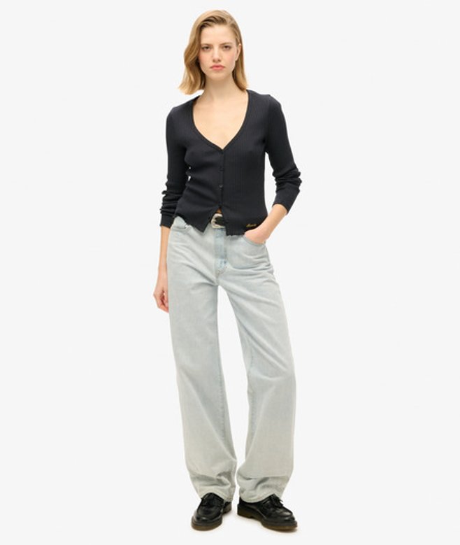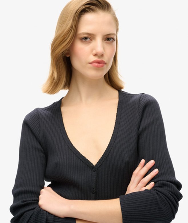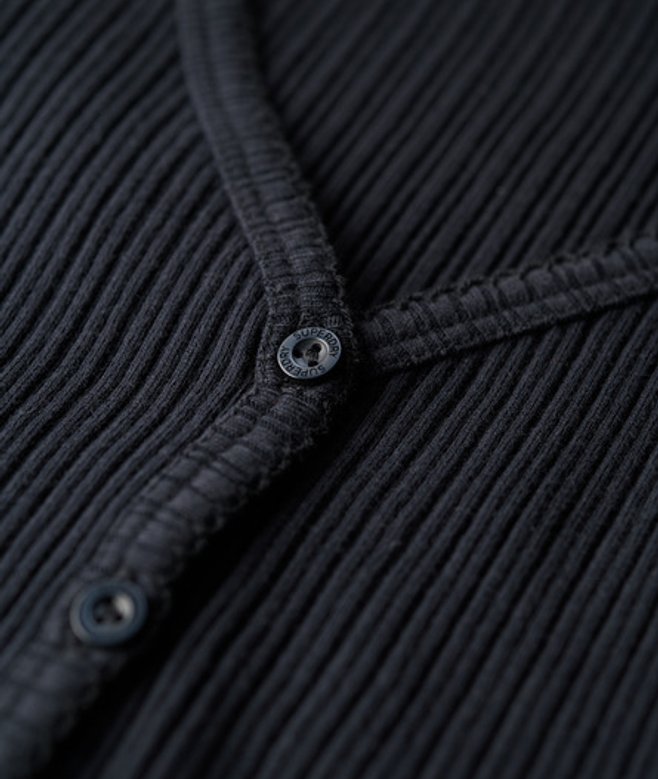 Slimfit - de nauw aansluitende pasvorm zorgt voor een getailleerd silhouet V-hals en lange mouwen Knoopsluiting over de hele lengte Geborduurd logo op de boord De Essential top met knopen en lange mouwen is eenvoudig en stijlvol, en gemaakt van een zacht, geribd materiaal voor een luxueus comfortabel gevoel.