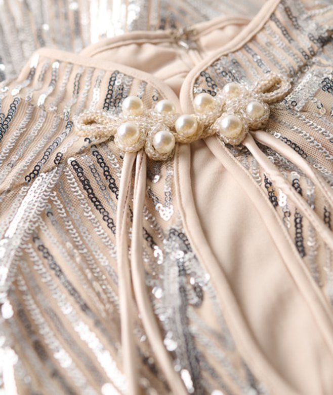 Geef je feestgarderobe dit seizoen een boost met onze mini-jurk met mandarijnkraag en pailletten.