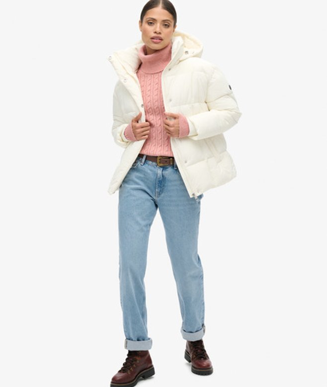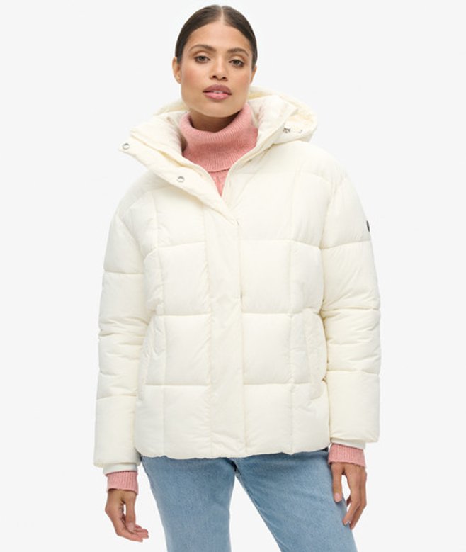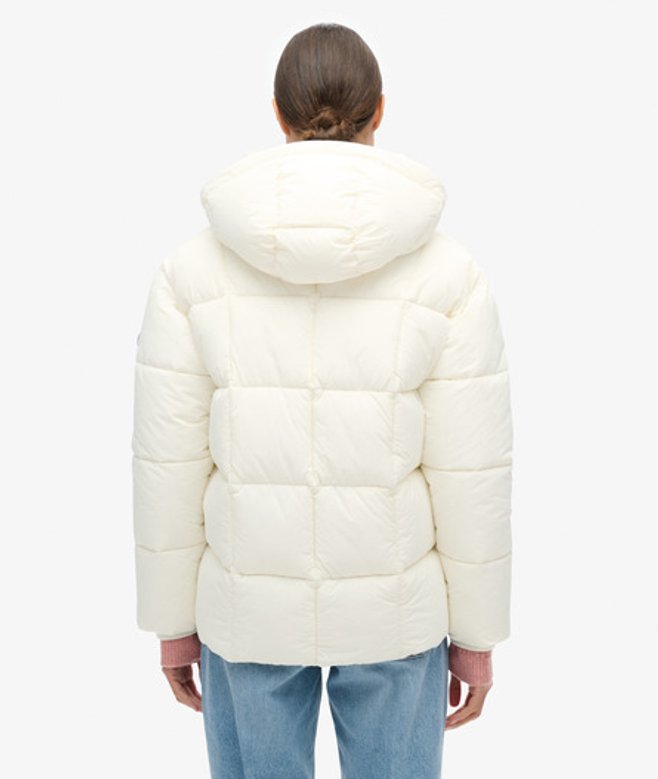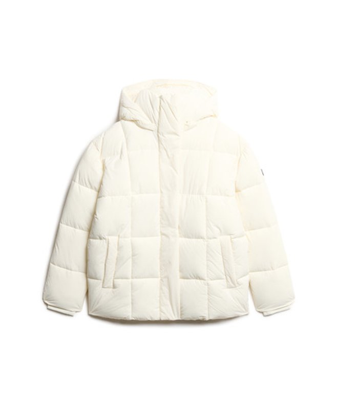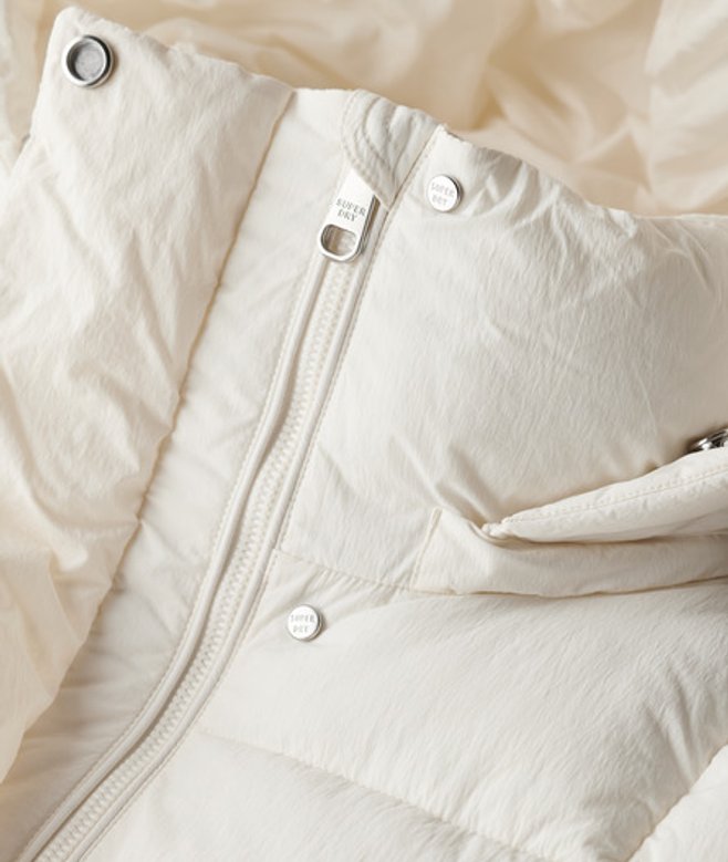 Kies je gebruikelijke maat Capuchon met trekkoord Rits- en drukknoopsluiting Twee zakken met drukknoopsluiting Geribde manchetten Gevuld met 100% gerecycled polyester Superdry-merklabel op de mouw