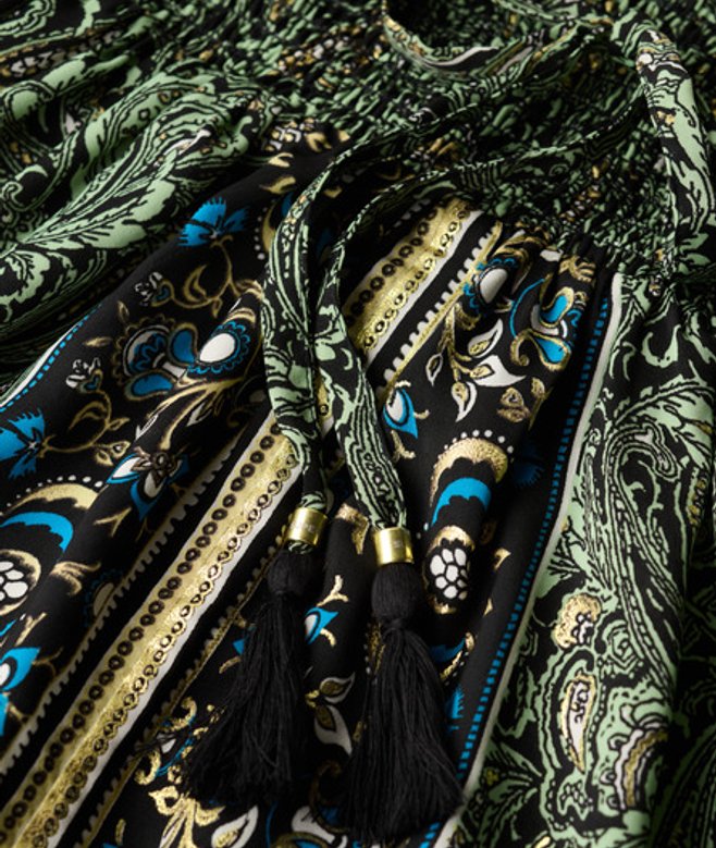 All-over botanische print met metallic details Tailleband met smokwerk en een bijpassende knoopriem Til je zomergarderobe naar een hoger niveau met de St.