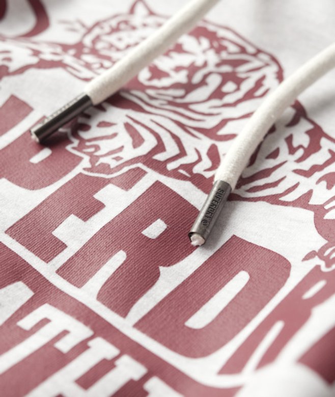 Kies je gebruikelijke maat Capuchon met trekkoord Geribde boorden Buidelzak aan de voorkant Grafische print op de borst Geborstelde voering Kenmerkende logopatch