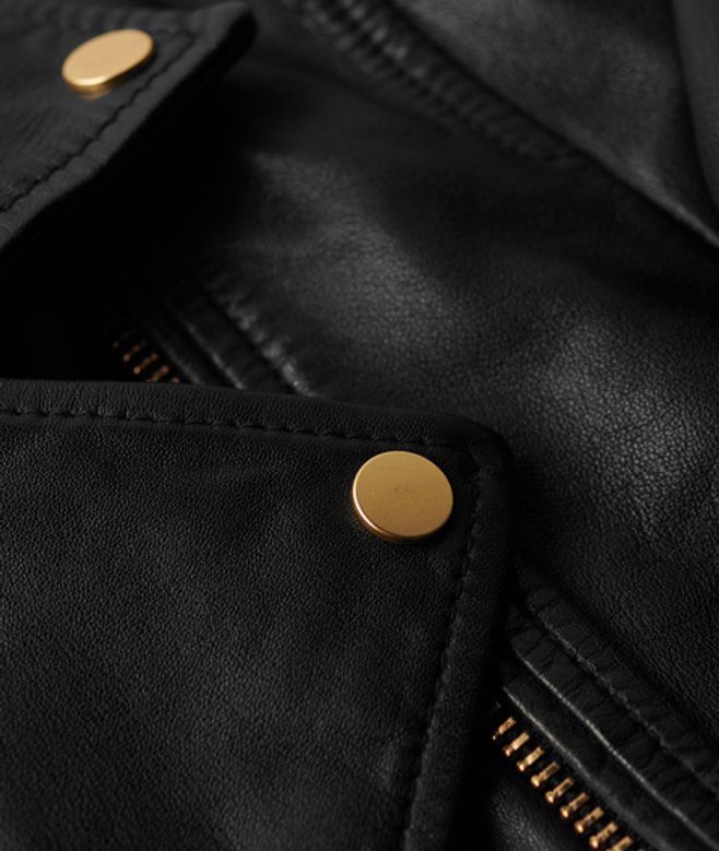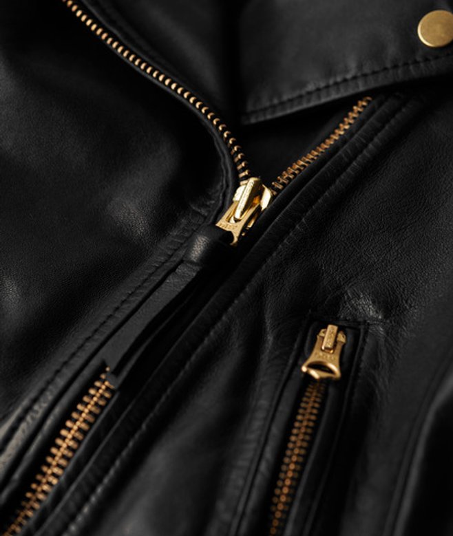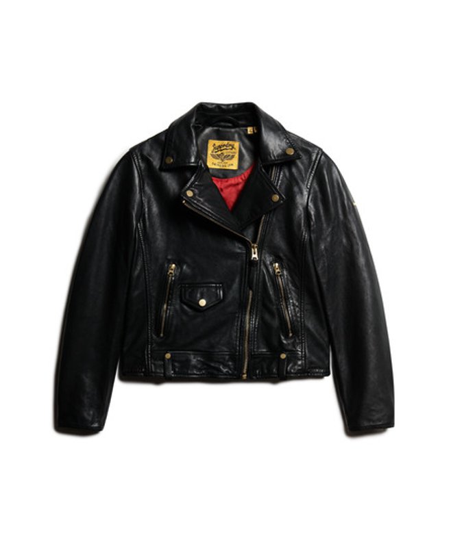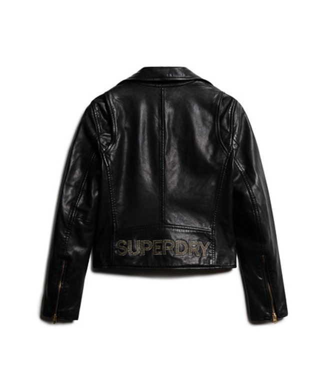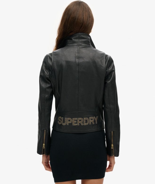 Door de slimfit-pasvorm zie je er niet alleen trendy uit, maar krijg je ook wat attitude. Slimfit - de nauwsluitende pasvorm zorgt voor een getailleerd figuur Lange mouwen Volledige rits Kraag met knoopdetails Drie buitenzakken Eén binnenzak Lussen voor een riem Echt lamsleer Superdry-woordmerk in studs op de achterkant, met extra versiering Metalen Superdry-label aan de zijkant van de mouw