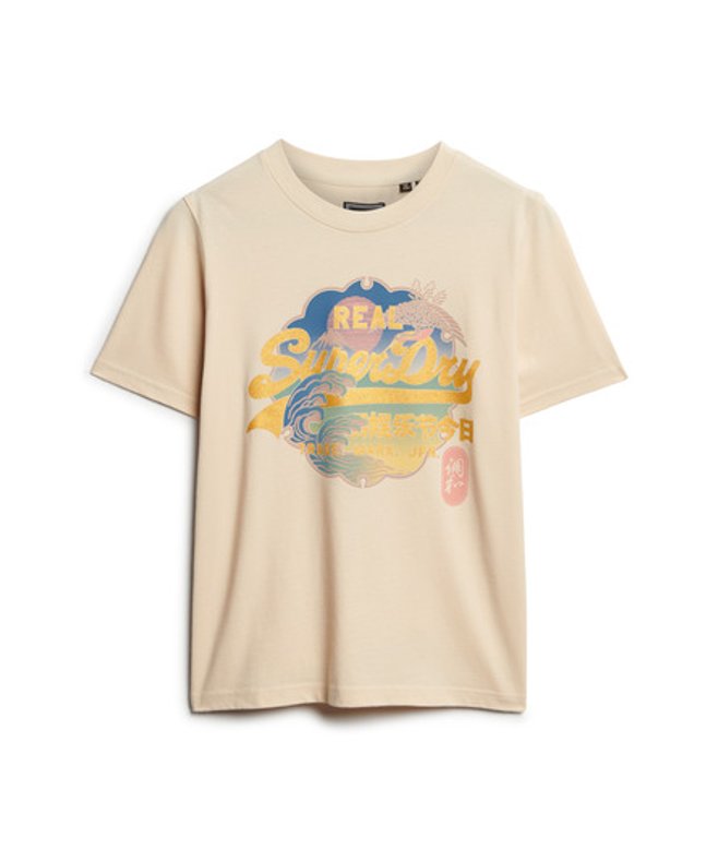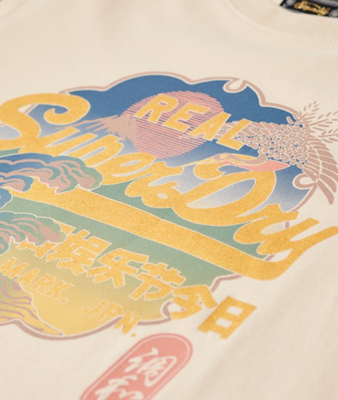 Kies je gebruikelijke maat Ronde hals Korte mouwen Grafische print Logolabel op de mouw Ons logo, met een trilogie van Japanse iconen in de vorm van The Wave, de kraanvogel en Mount Fuji, knalt dankzij de gouden opdruk.