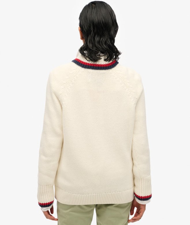 We hebben ons laten inspireren door vintage gebreide kleding, wat je kunt zien aan de contrasterende boorden en de algehele vibe van de trui.