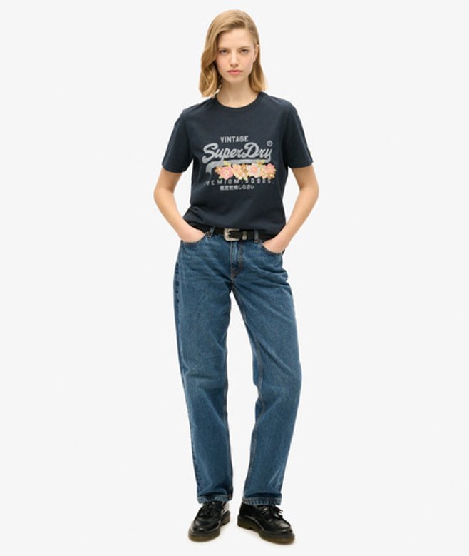 Kies je gebruikelijke maat Geribbelde ronde halslijn en korte mouwen Grafische print met bloemenborduursel Ons Premium Goods T-shirt met bloemenprint en vintage logo is net zo comfortabel en nonchalant stijlvol als je zou verwachten, met ons klassieke vintage logo met delicate geborduurde bloemen voor een vleugje vrouwelijkheid.