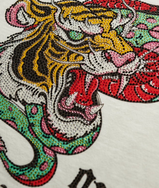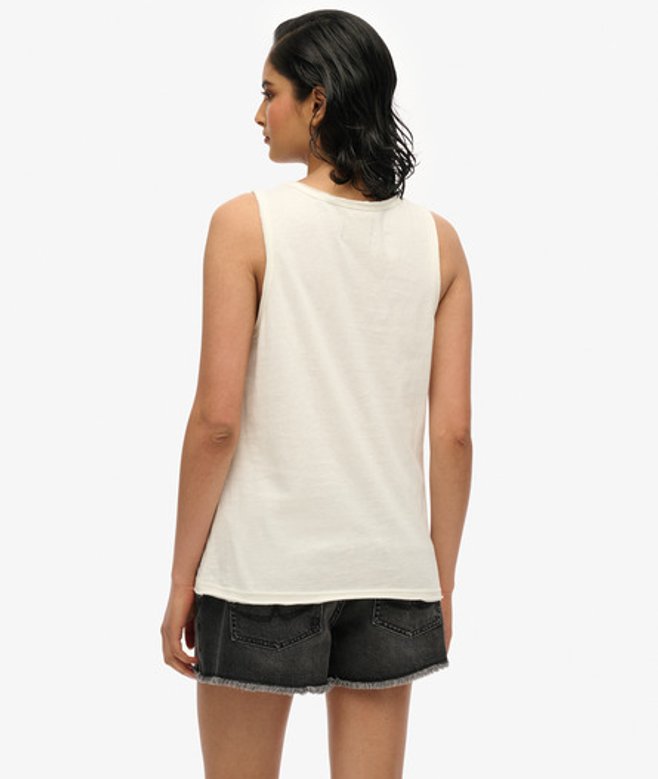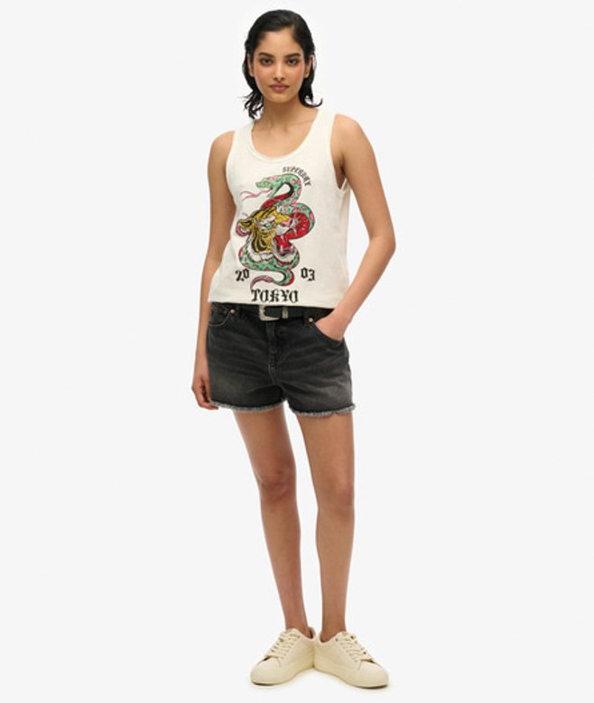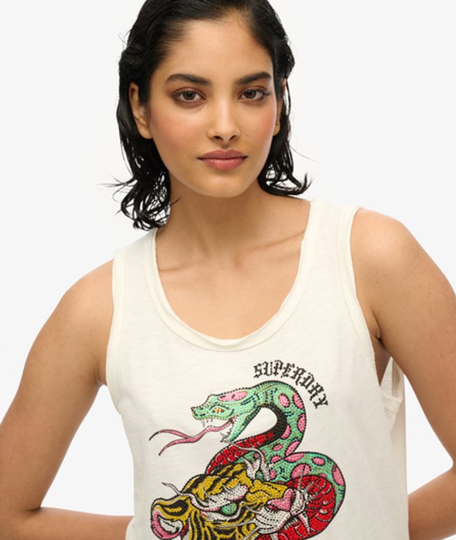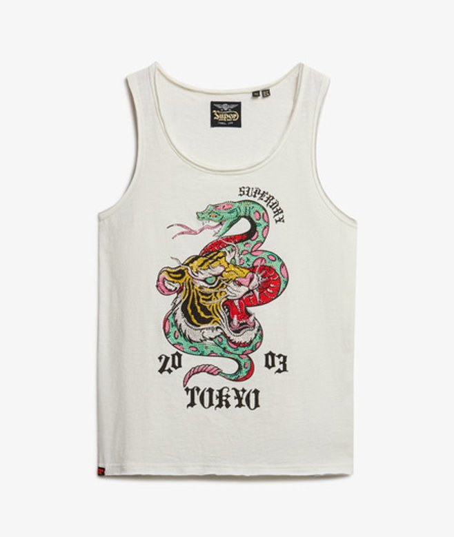 Kies je gebruikelijke maat Ronde hals met onafgewerkte voering Grote versierde afbeelding op de voorkant Kenmerkend label op de zoom De Neo Trad Tattoo-tanktop met laag uitgesneden ronde hals is geïnspireerd op traditionele tattoo-afbeeldingen en is een klassieke Superdry-top.