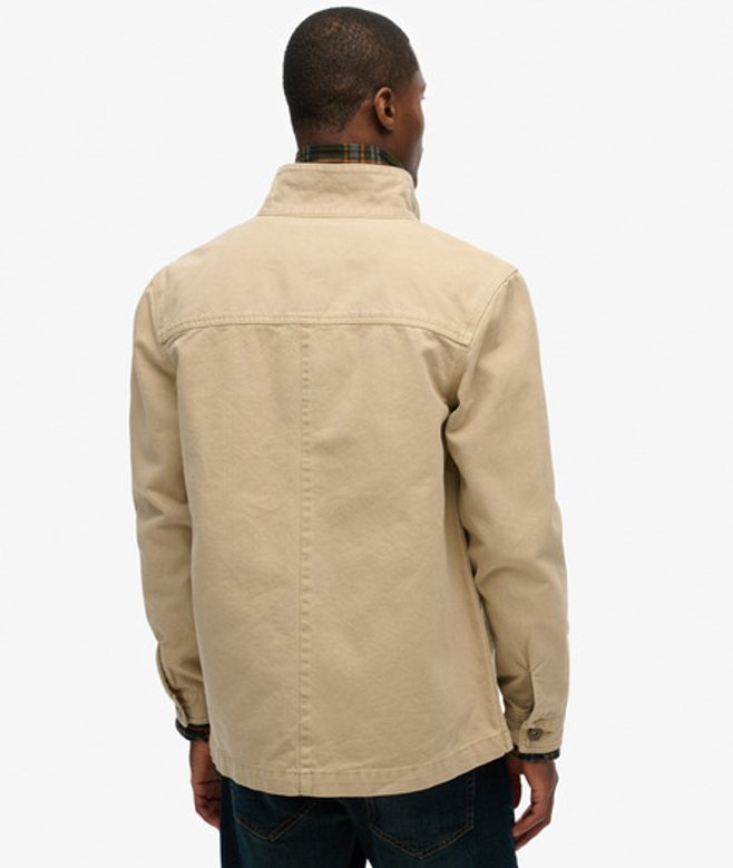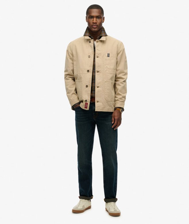 Kies je gebruikelijke maat Enkele kraag met knoopsluiting Vier buitenzakken en twee binnenzakken Kenmerkend label op de zak Geef je garderobe dit seizoen een boost met onze Merchant canvas Worker-jas.