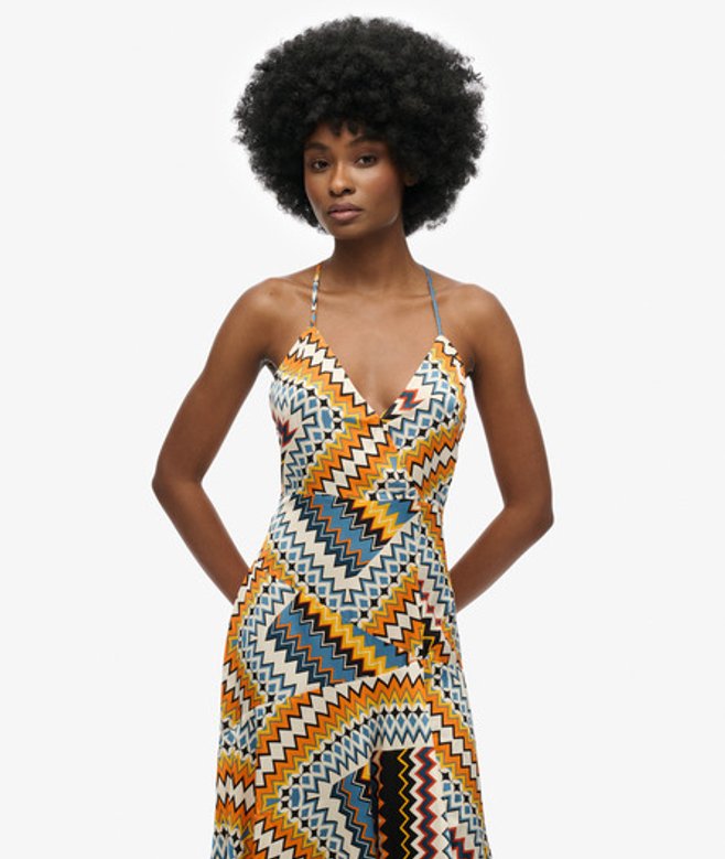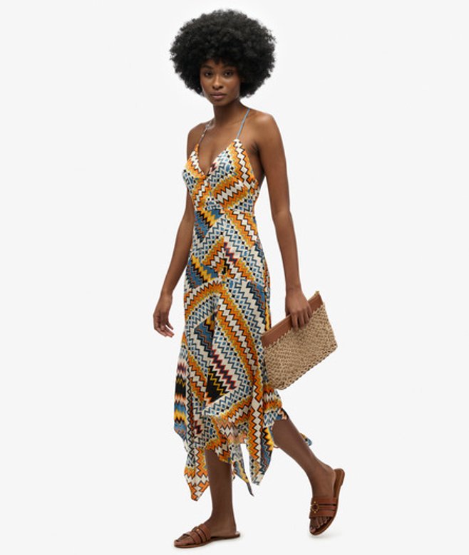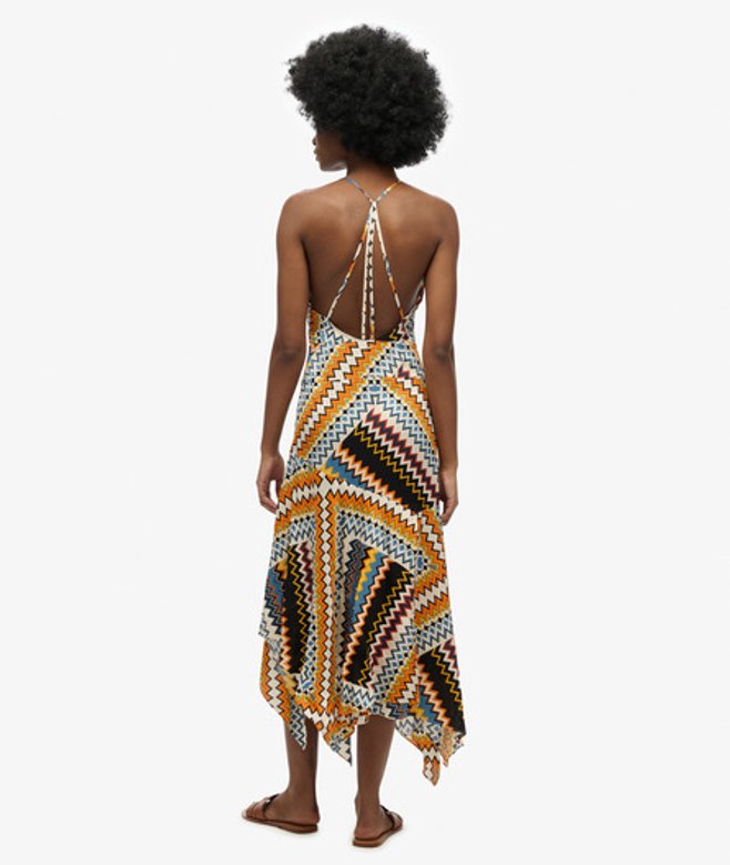 Kies je gebruikelijke maat Spaghettibandjes en een diepe V-hals Camistijl met een midilengte Zakdoekzoom met subtiele lagen op de rok Kenmerkend metalen label aan de achterkant Trendy en ontworpen met jouw garderobe in gedachten.