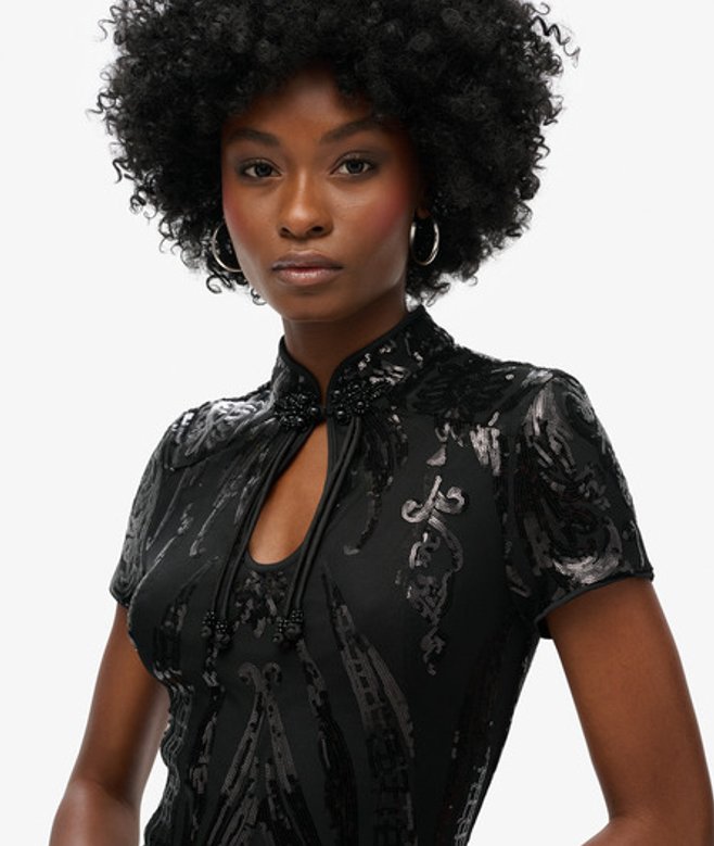 We hebben de klassieke feestjurk met pailletten en een stijlvolle mandarijnkraag genomen en er de gewilde Superdry-twist aan gegeven. Slimfit - de nauw aansluitende pasvorm zorgt voor een getailleerd figuur UK10 schouder tot zoom: 86 cm Kraagloze boord Uitsnede met versieringen Korte mouwen Korte zijsplit Volledig gevoerd Verborgen rits aan de achterkant