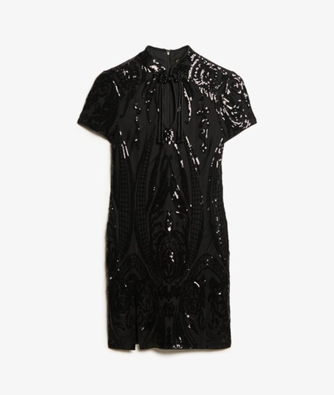 Geef je feestgarderobe dit seizoen een boost met onze mini-jurk met mandarijnkraag en pailletten.