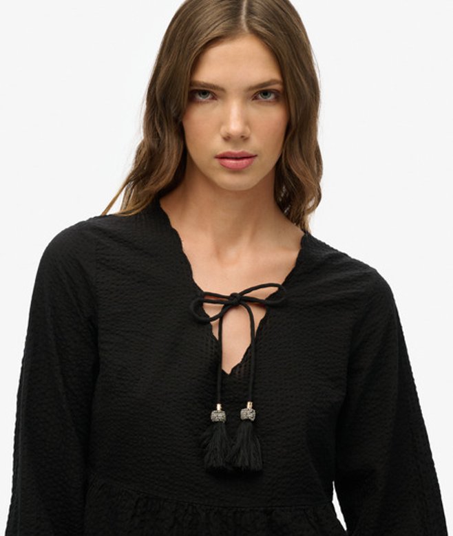 Losse pasvorm - de stijlvolle losse pasvorm maakt dit tot een must-have waarin comfortabel en cool samenkomen Lange mouwen en elastische manchetten Diepe V-hals met geschulpte voering en een verstelbaar trekkoord met kwastjes Gelaagde rok met geschulpte zoom en een kenmerkend metalen lipje Een heerlijke zomerse verfrissing.