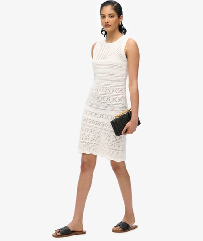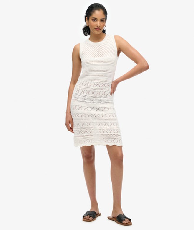 Slimfit - de nauwsluitende pasvorm zorgt voor een meer geklede look Mini-jurk met een hoge halslijn Gehaakte stof met een kenmerkend metalen label aan de achterkant van de halslijn Onze gehaakte mini-jurk is de perfecte zomerjurk om mee te nemen op vakantie of voor een dagje strand.