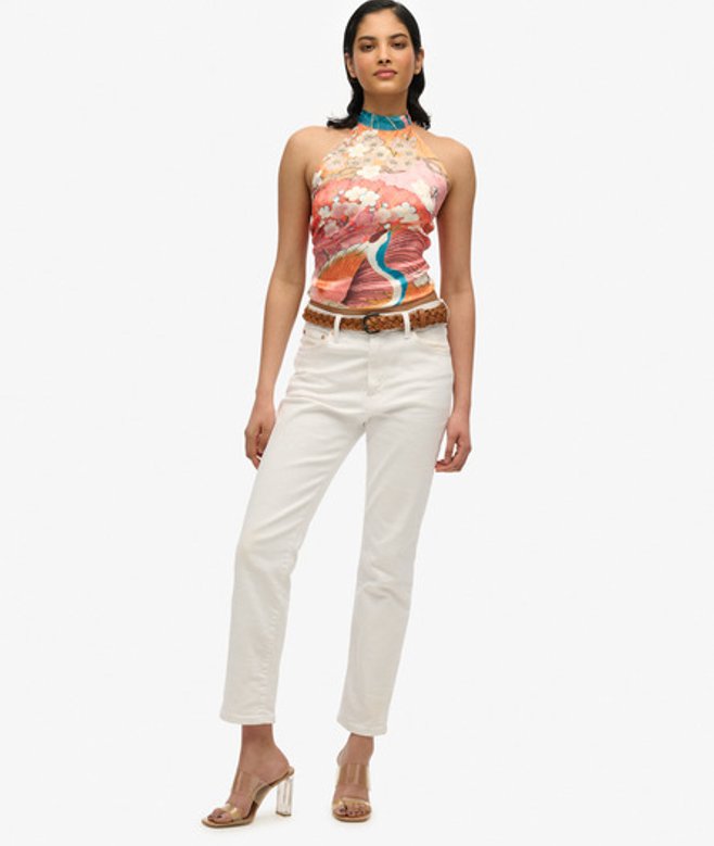 Kies je gebruikelijke maat Halternek Striksluiting aan de achterkant All-overprint Onze haltertop van jacquard is een opvallend kledingstuk dat voorzien is van een Japans geïnspireerde print om je creativiteit te laten zien.