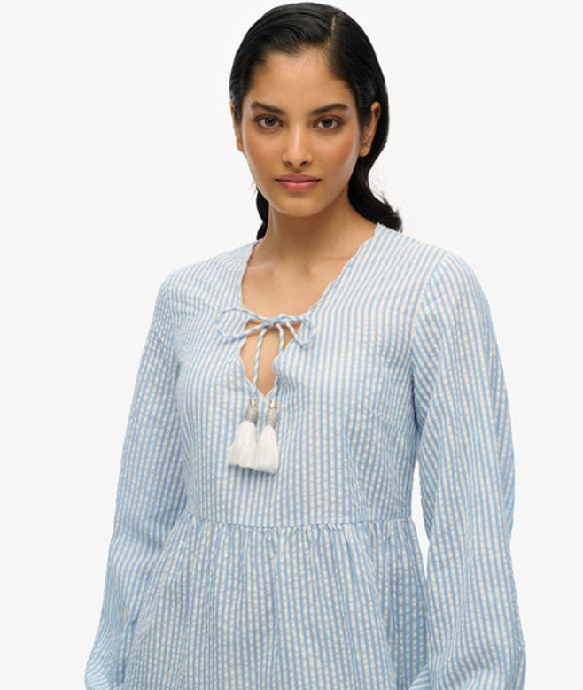 Losse pasvorm - de stijlvolle losse pasvorm maakt dit tot een must-have waarin comfortabel en cool samenkomen Lange mouwen en elastische manchetten Diepe V-hals met geschulpte voering en een verstelbaar trekkoord met kwastjes Gelaagde rok met geschulpte zoom en een kenmerkend metalen lipje Een heerlijke zomerse verfrissing.