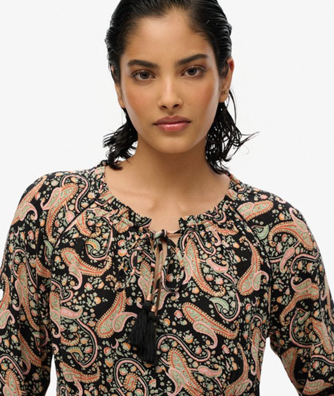 Kies je gebruikelijke maat Gerimpelde halslijn en een halssluiting met kwastjes Knoopsluiting over de hele lengte en een geplooide achterkant Lange uitlopende raglanmouwen All-over paisleyprint De bedrukte blouse met lange mouwen is gemaakt van een lichtgewicht, gekreukeld materiaal voor een echt bohemien gevoel waarmee je moeiteloos je stijl transformerert met een vleugje paisley.