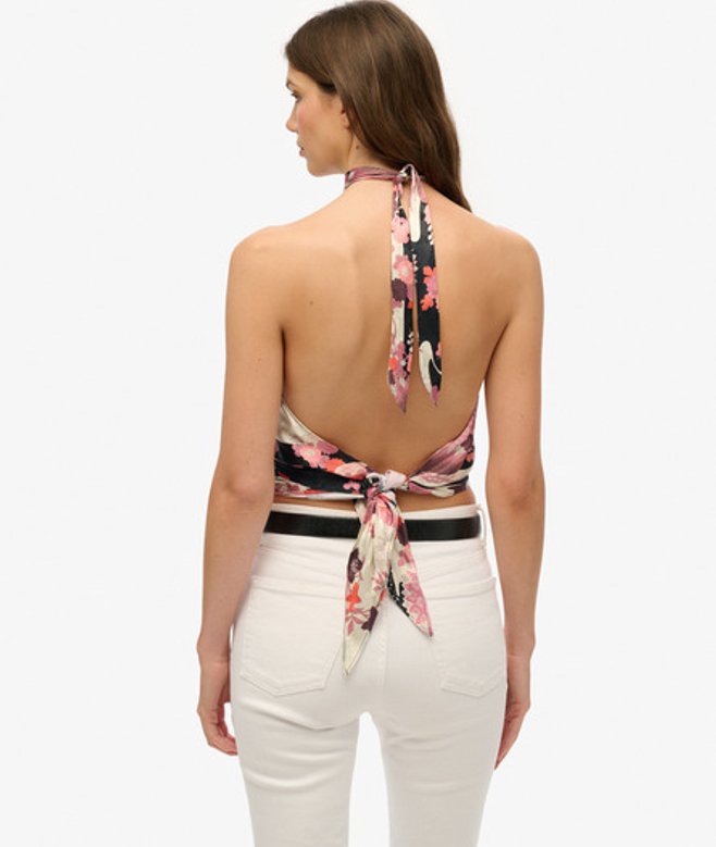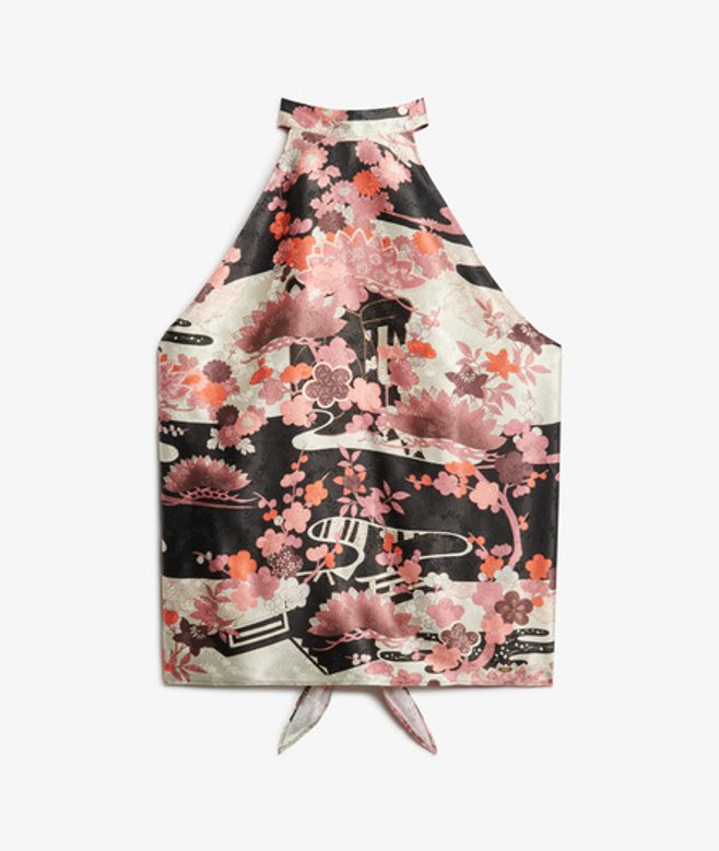 Kies je gebruikelijke maat Halternek Striksluiting aan de achterkant All-overprint Onze haltertop van jacquard is een opvallend kledingstuk dat voorzien is van een Japans geïnspireerde print om je creativiteit te laten zien.