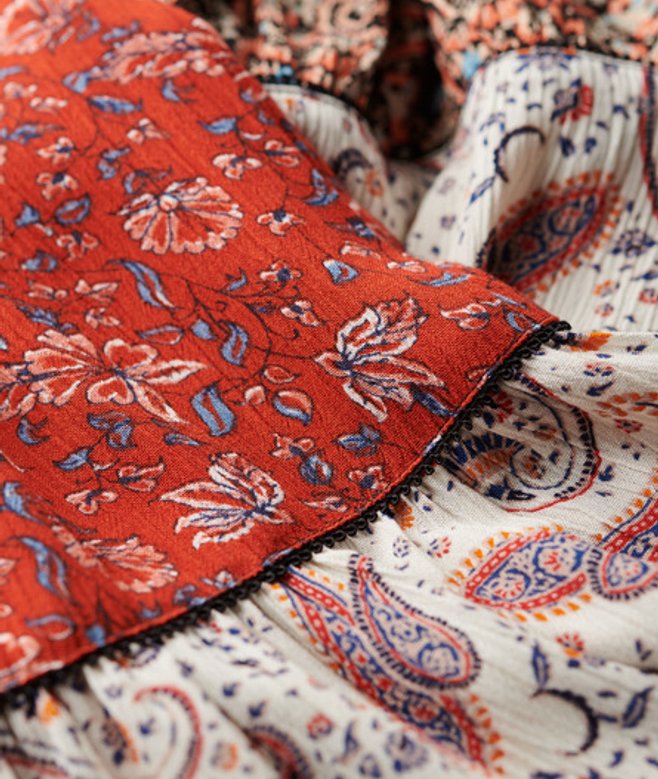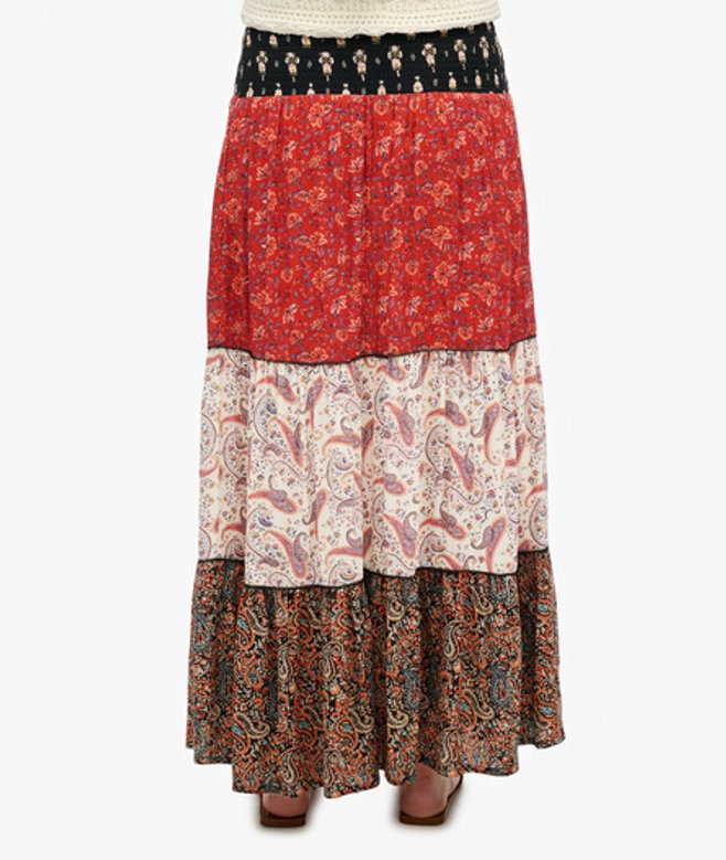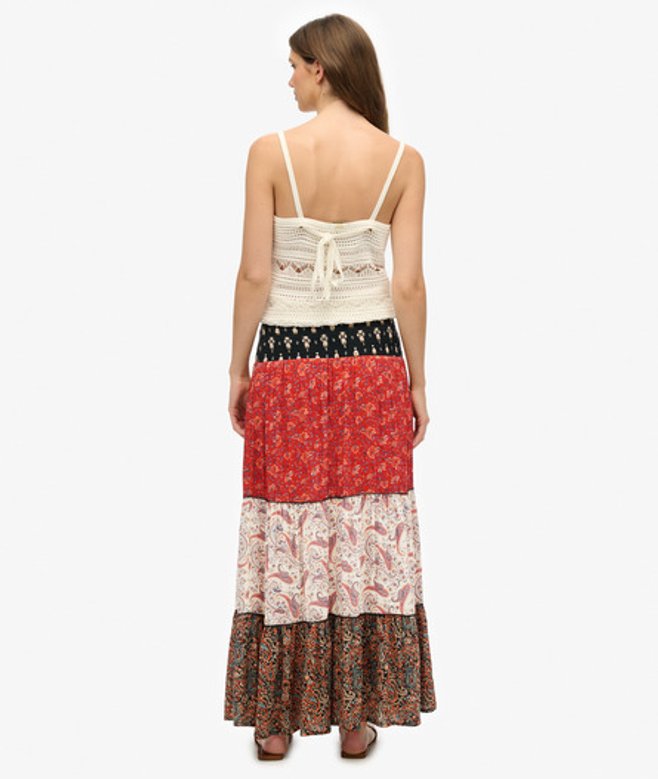 Kies je gebruikelijke maat Maxilengte met een elastische tailleband Geweven kreukstof Laagjes met kanten details Kenmerkend metalen label op de zoom De perfecte rok om aan je garderobe toe te voegen.