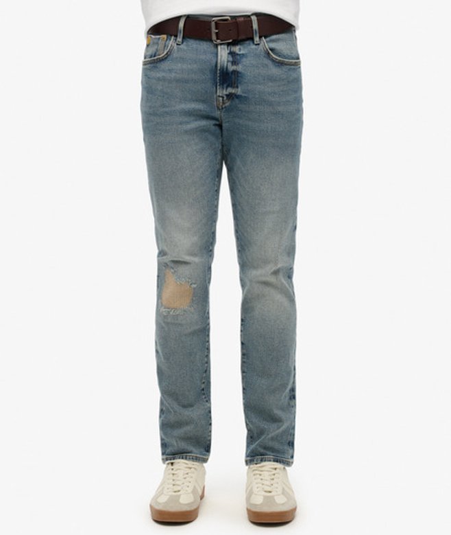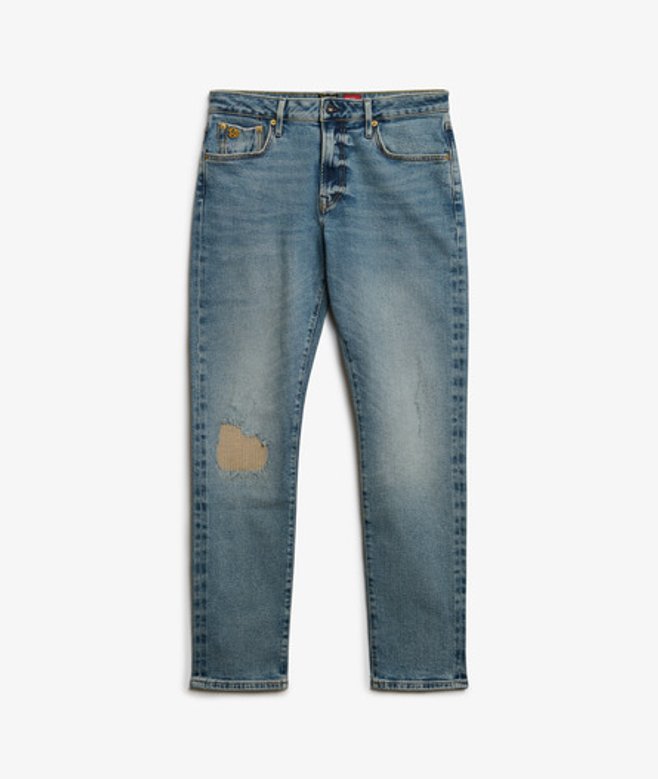Katoenen selvedge-denim Knoop- en ritssluiting Klassiek ontwerp met vijf zakken Vintage wassing met lage impact Superdry-patches Met de hand getekende branding Premium hardware