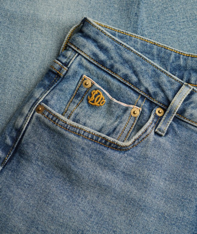 De denim voor deze hoogwaardige jeans is geweven op een schietspoelgetouw, waardoor de stof smaller is en een strakker weefsel heeft, waardoor deze duurzamer en zwaarder is.