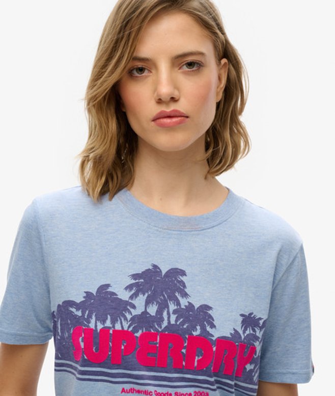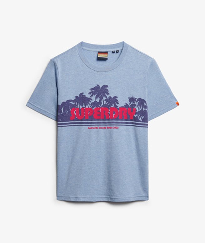 Kies je gebruikelijke maat Ronde halslijn met een grote print op de borst Kenmerkend label op de mouw Het gestreepte Outdoor-T-shirt met relaxte pasvorm is afgewerkt met een tropische afbeelding met getextureerde, contrasterende tekst op de borst om je tijdens je vakantie een stijlvolle look te geven.