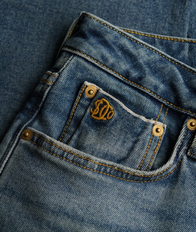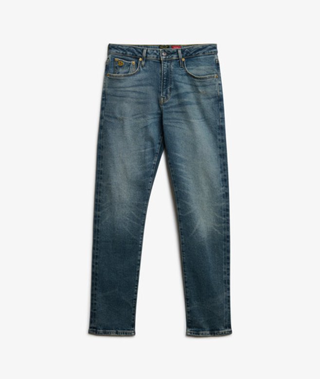 Katoenen selvedge-denim Knoop- en ritssluiting Klassiek ontwerp met vijf zakken Vintage wassing met lage impact Superdry-patches Met de hand getekende branding Premium hardware