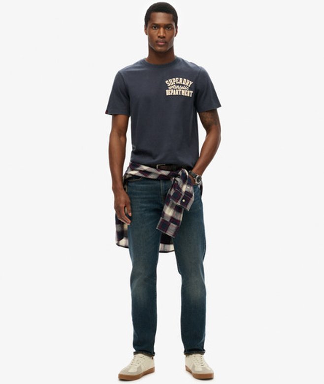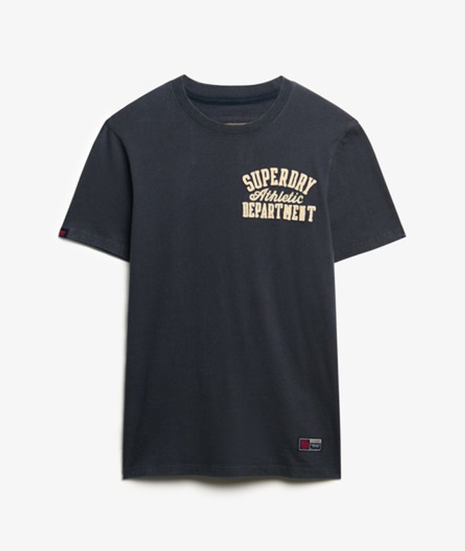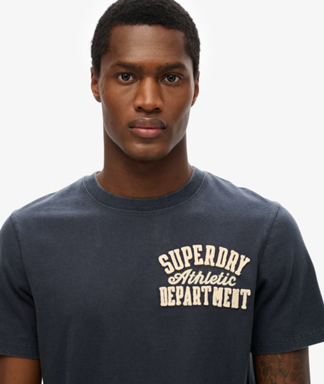 Ons Vintage Athletic-T-shirt heeft een tekstappliqué met gerafelde afwerking op de borst om dat authentieke vintage gevoel te versterken.