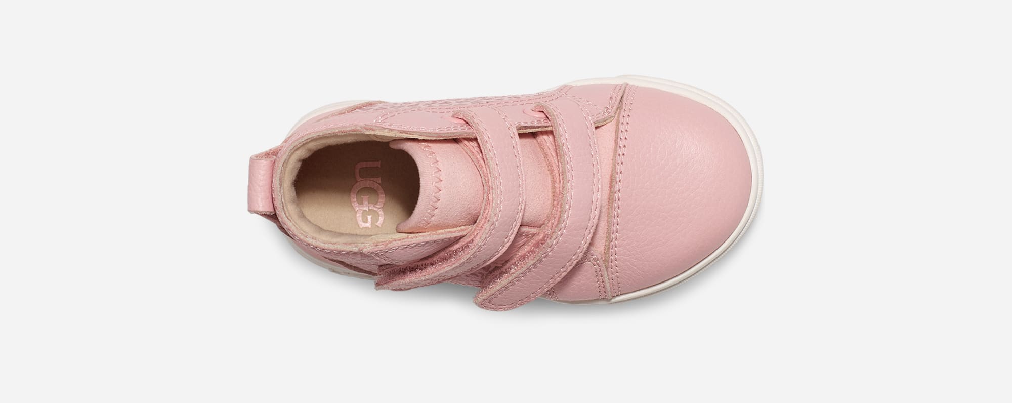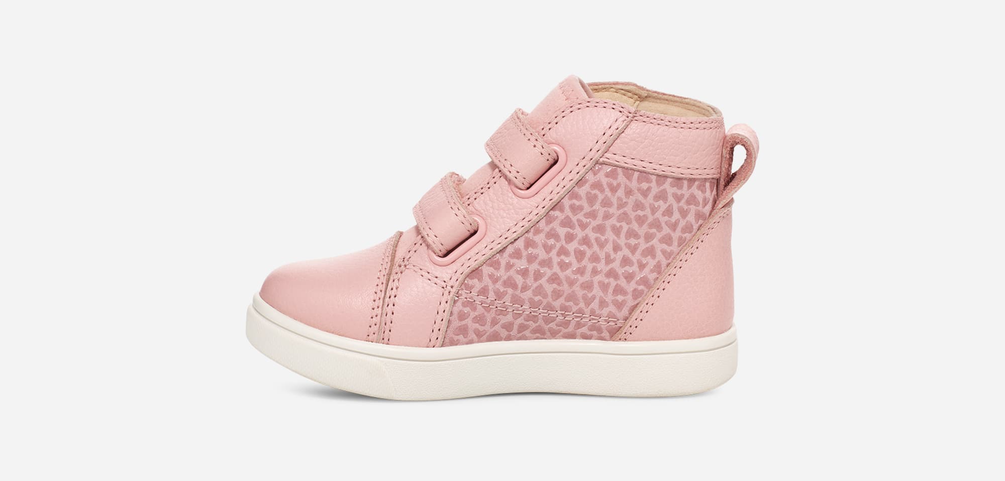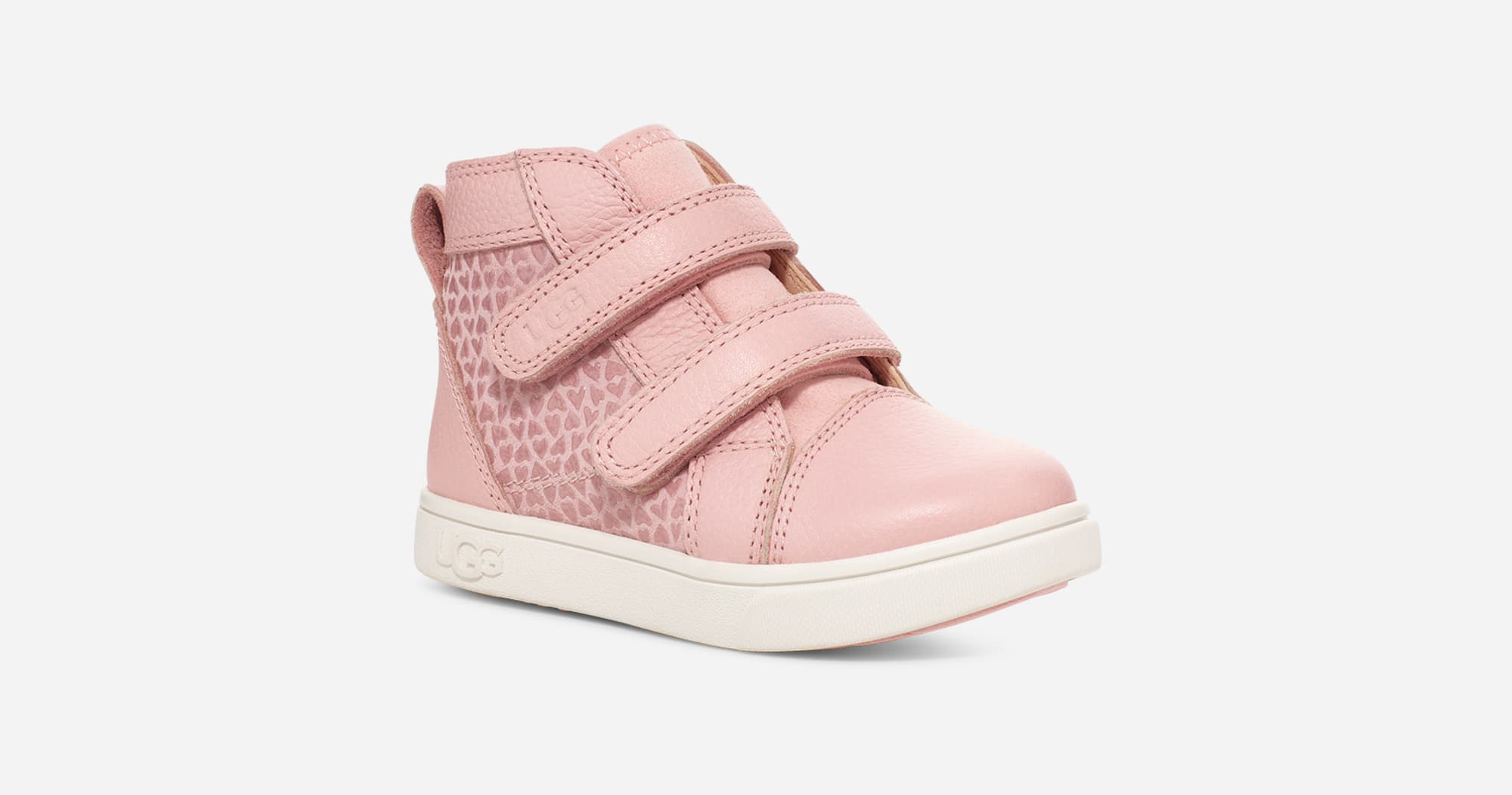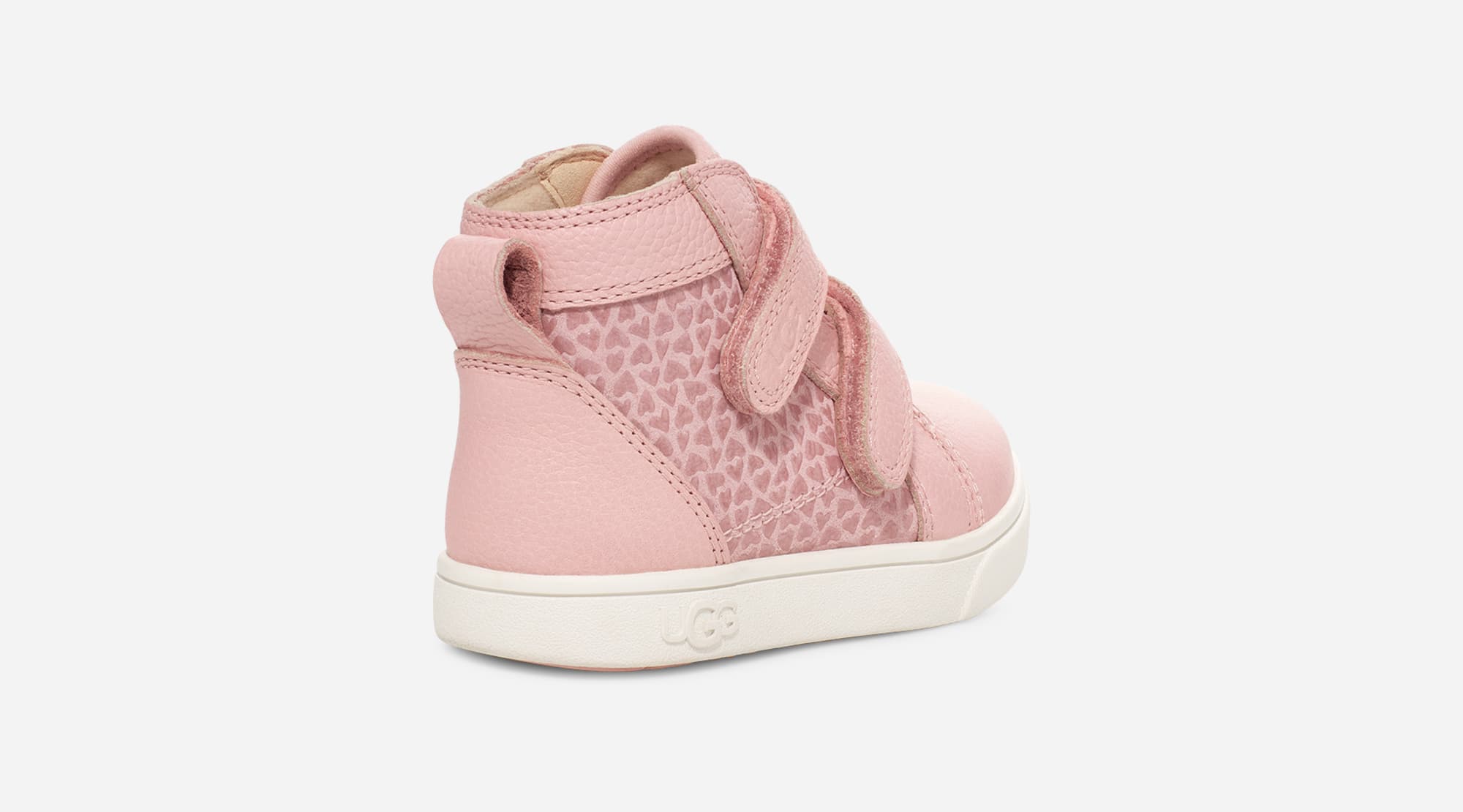This high-top sneaker is made from soft leather and suede decked with heart gel drops with kid-friendly hook-and-loop straps for easy entry and a custom fit.