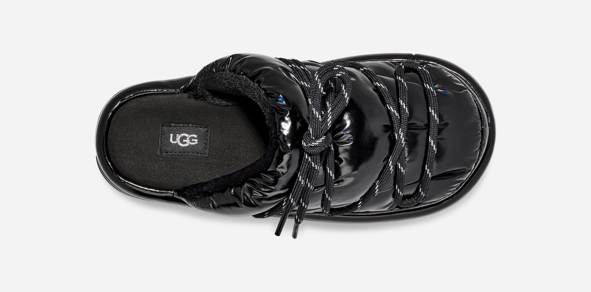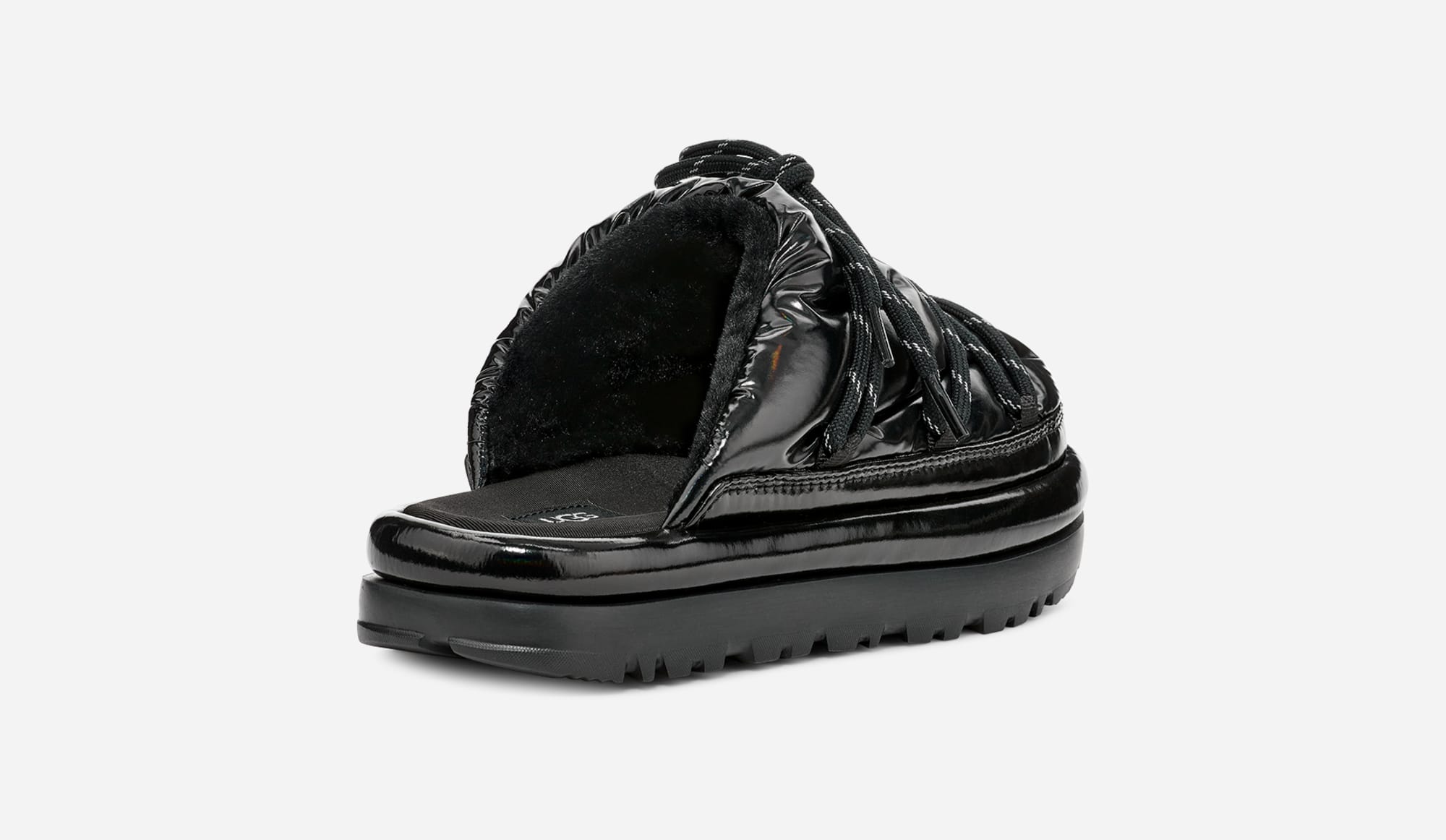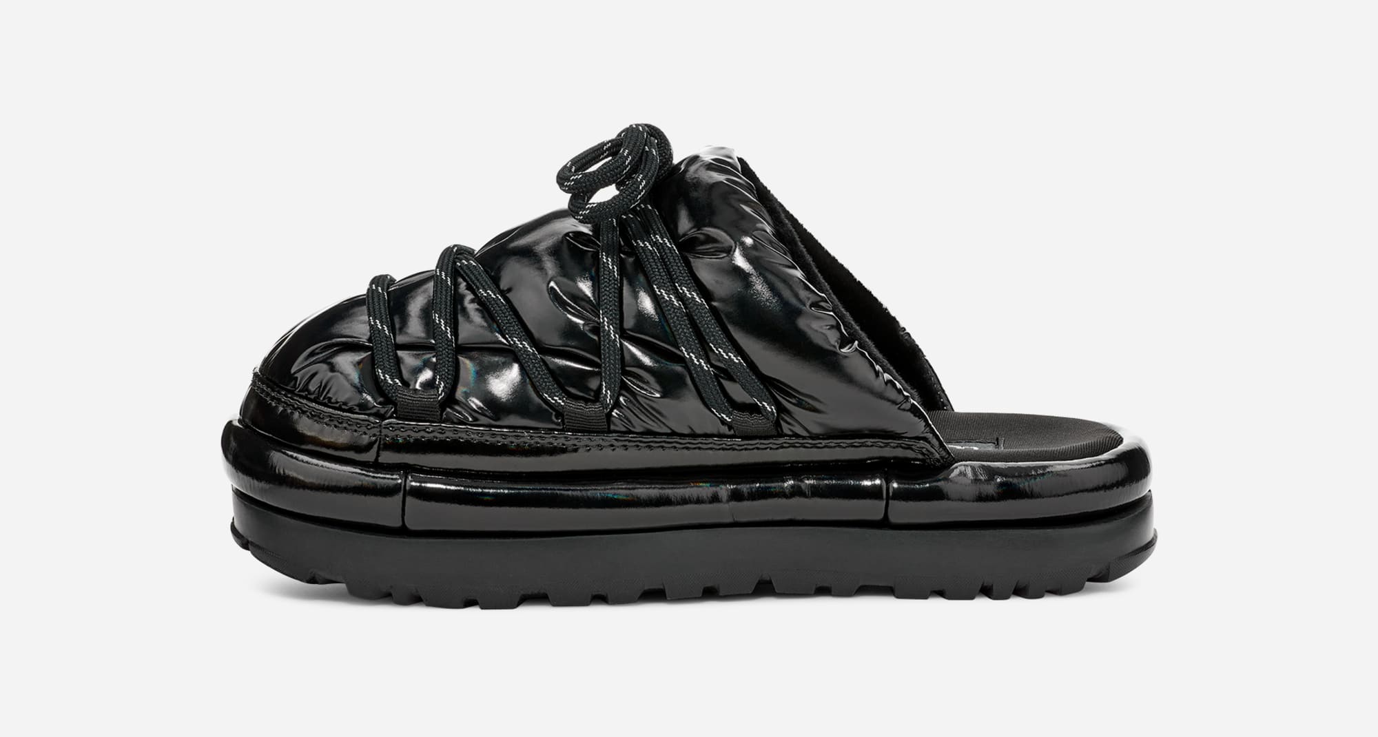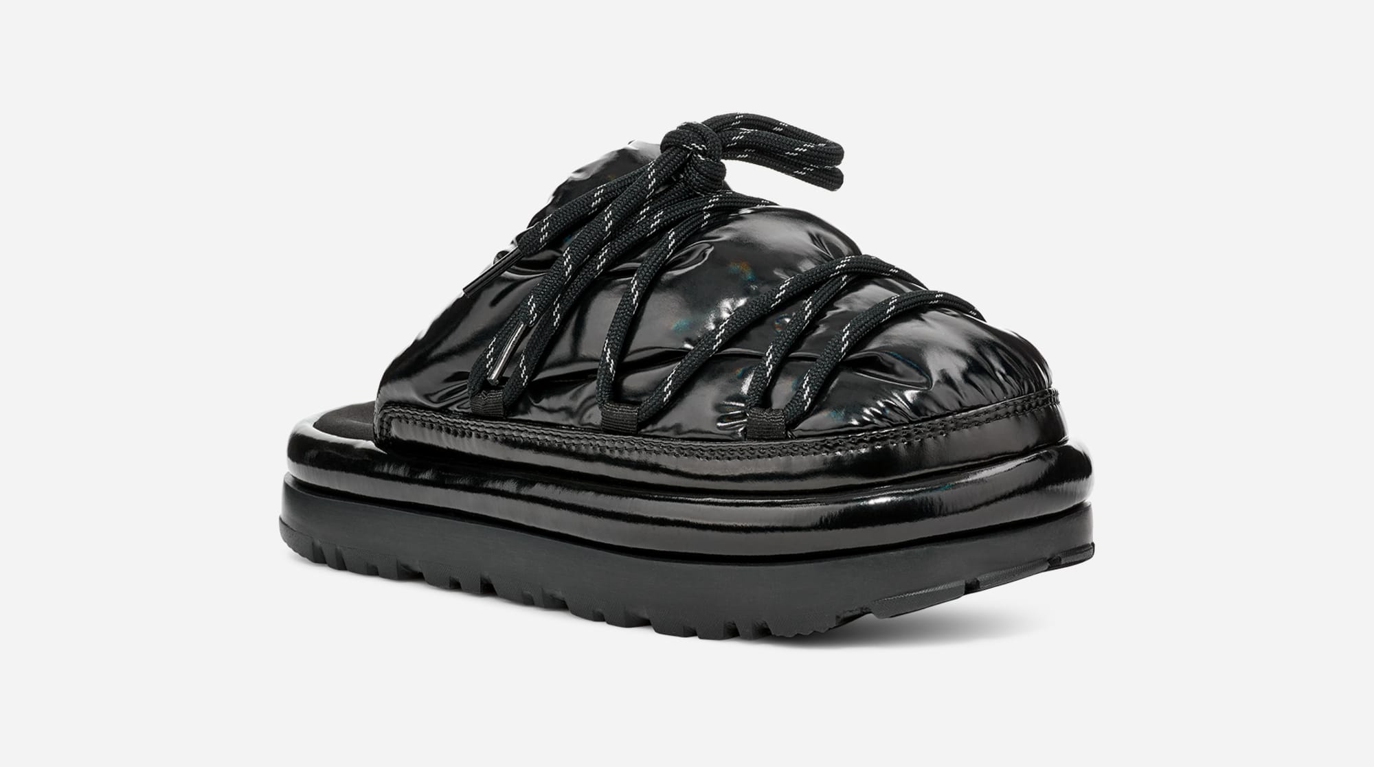 With out-of-this-world softness, a bit of a platform, and a shiny, maximalist exterior crisscrossed with reflective laces, the Hi Shine Spaceslider Slide offers a unique look and indoor/outdoor wear.