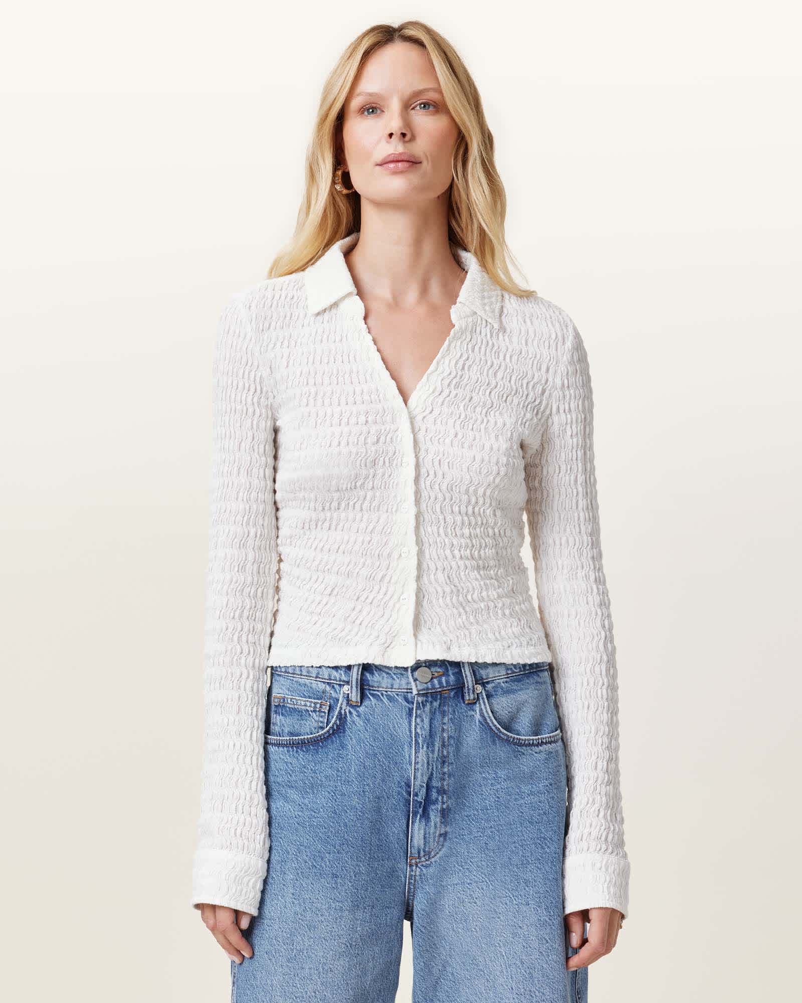 This shirt is designed to a slim fit Button closure Open V-neckline Collar Textured fabric Gathered side seams Clean finishes Lightweight