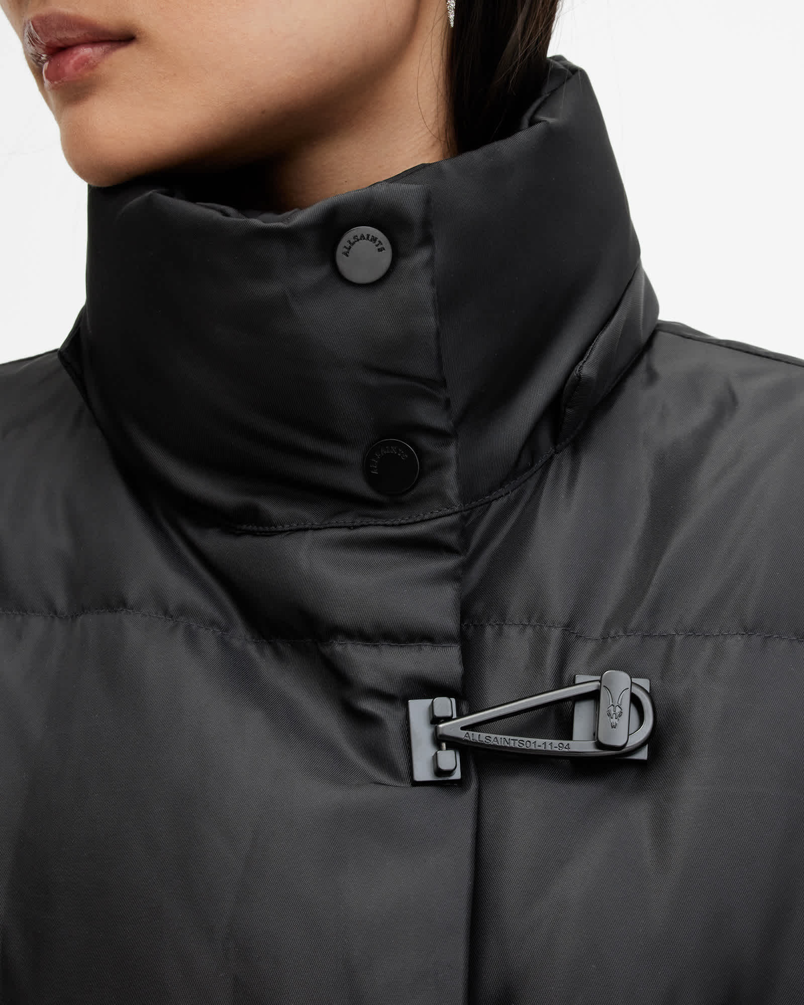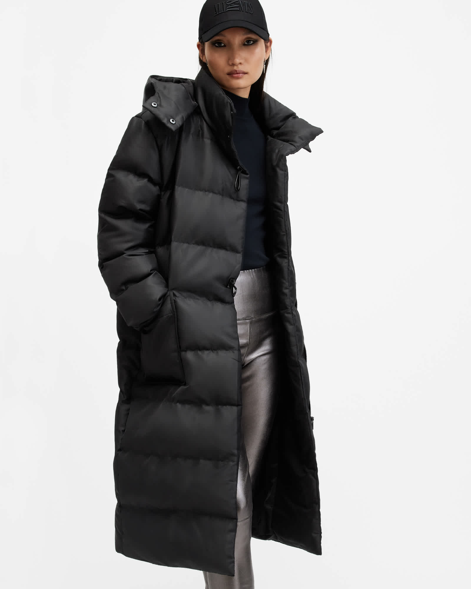 It's been made from recycled fabrics and filled with recycled materials too - what more could you ask for? This coat is designed to a regular fit that is true to size Zip closure Clasp lock closure Long sleeves Detachable hood Stand collar Quilted Long length Two patch pockets One interior pocket Signature matte black hardware Recycled materials