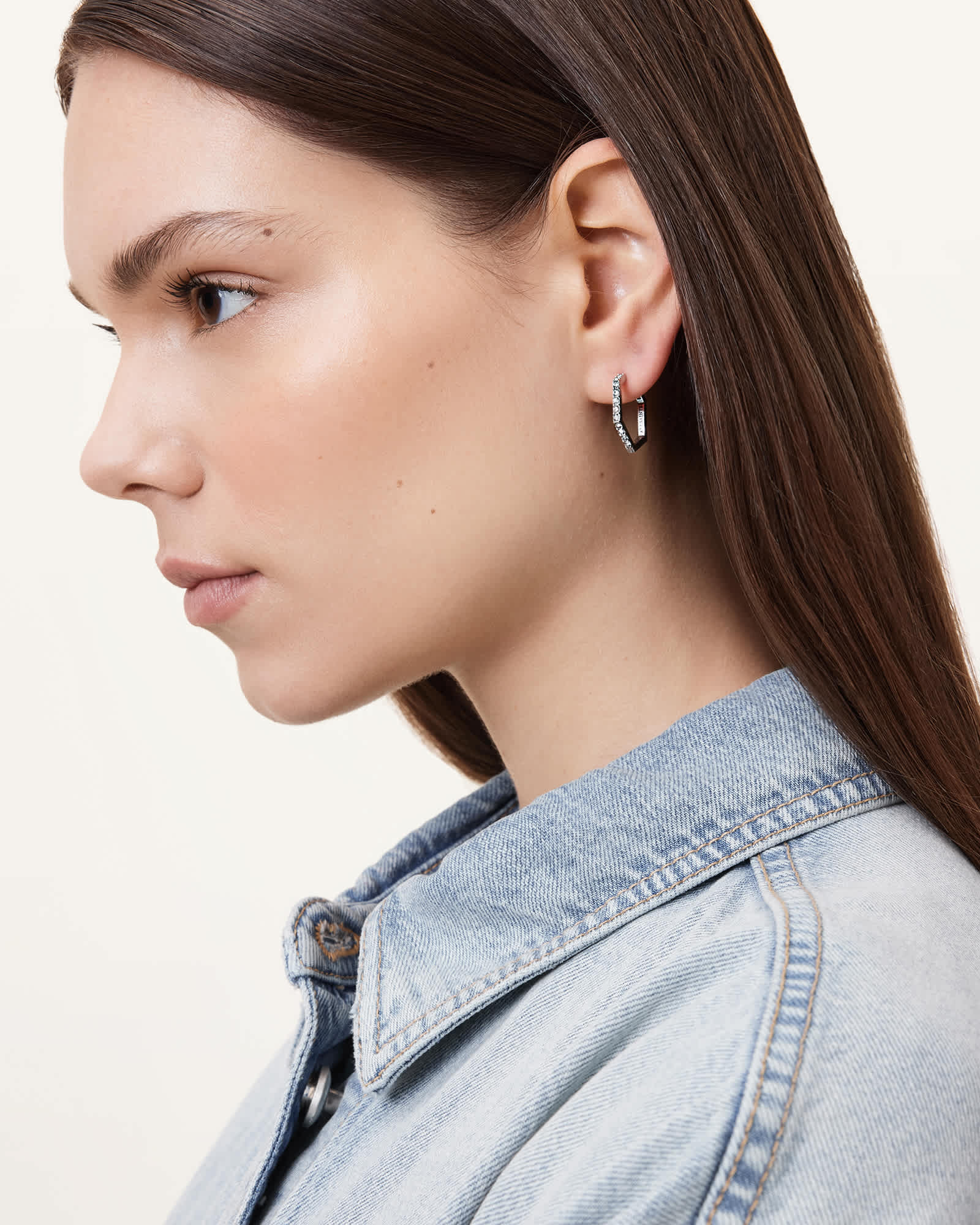 Hoop earrings Click-in closure Gemstone embellishments All Saints engraved signature Silver-tone finish