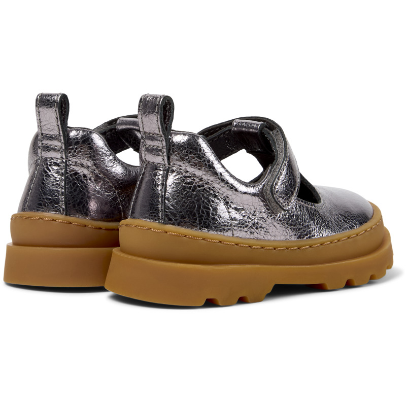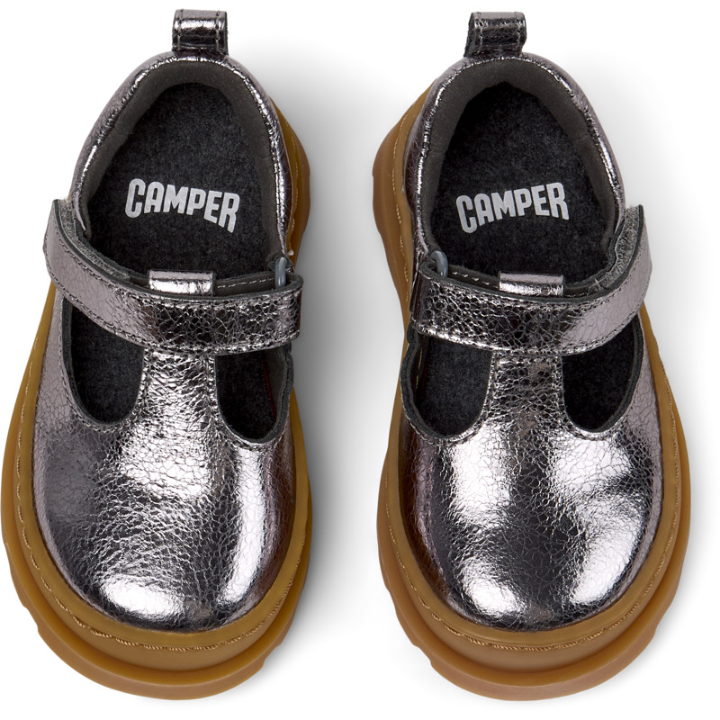 CAMPER - Silberner Kinderschuh aus Rindsleder mit OrthoLite® Recycled™-Fußbett, Klettverschluss und Gummilaufsohle (20% Recyclinganteil).