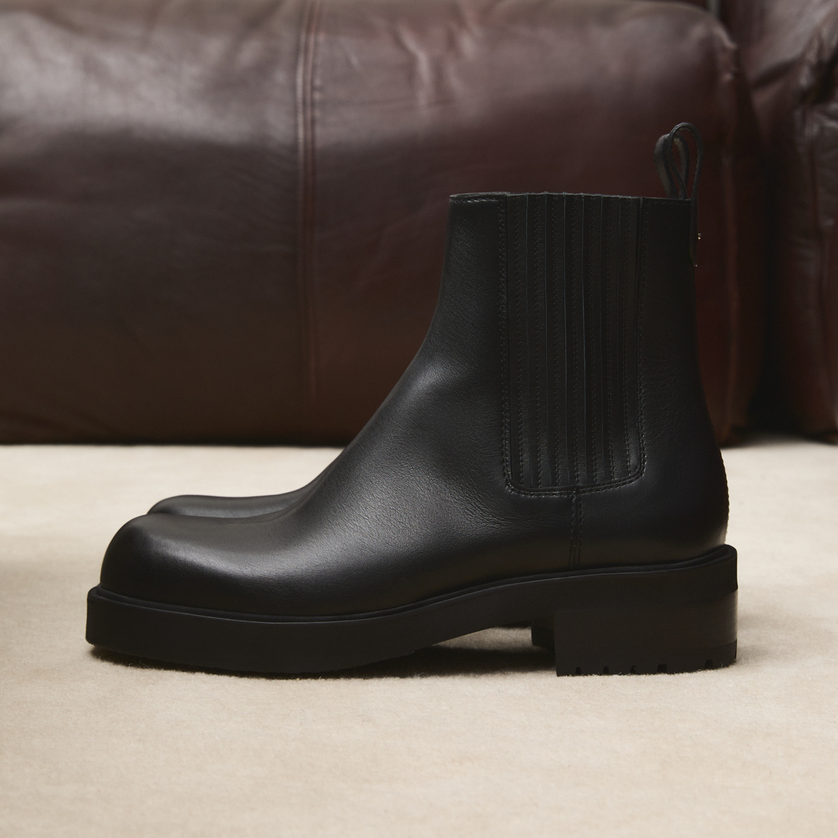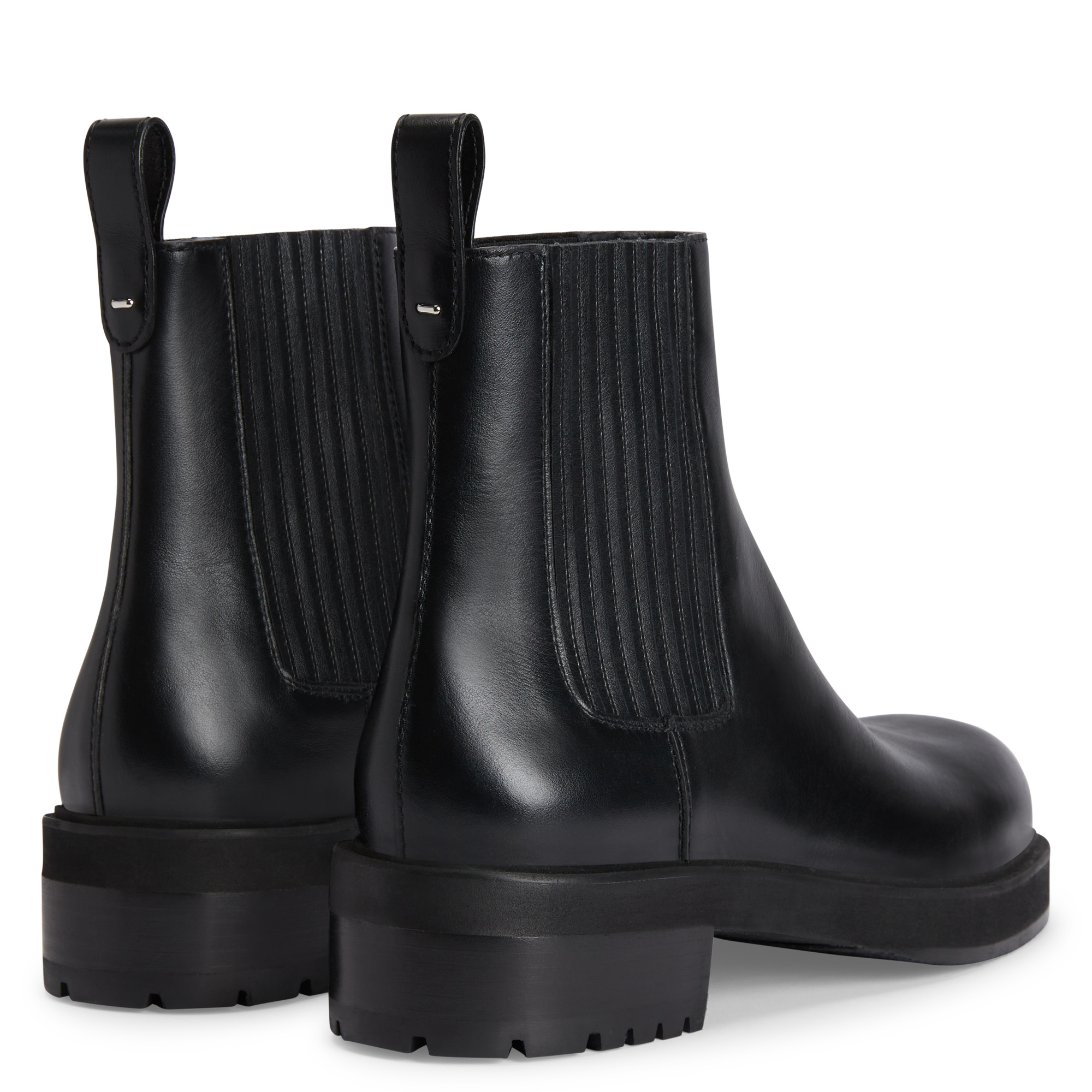 Leather Chelsea boots with leather-covered elastic insert on either side, metal detail and one-piece sole.