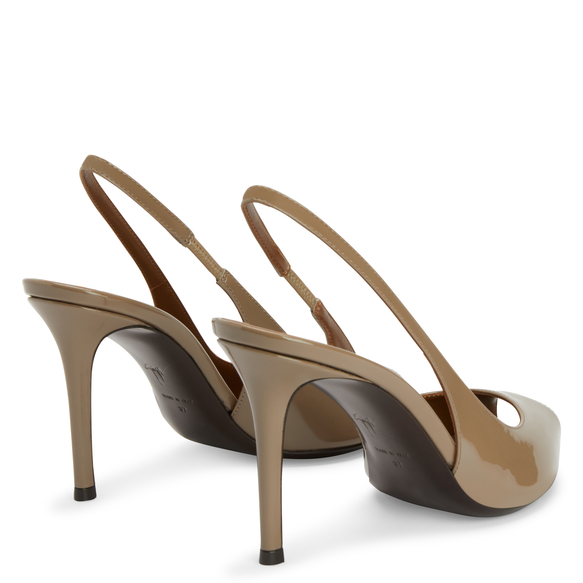 Open-toe patent leather slingback sandals with geometric topline, pointed insole and stiletto heel.