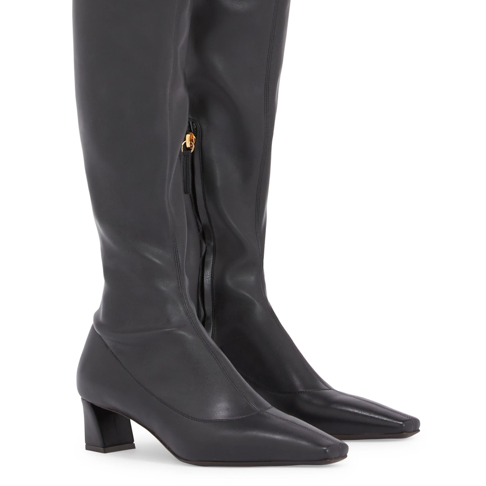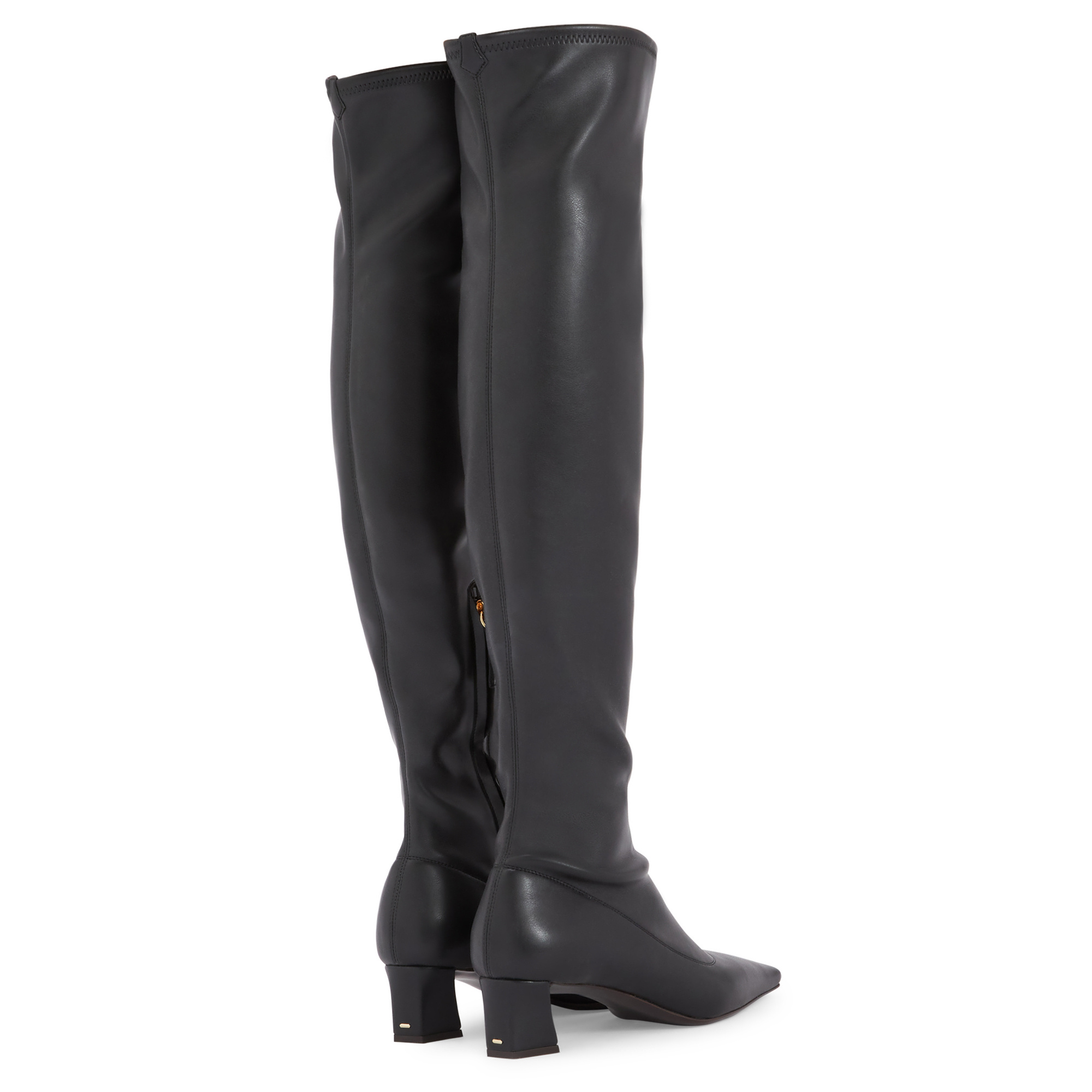 Over-the-knee boots in stretch leather-look fabric with a square toe and kitten heel with a metallic detail.