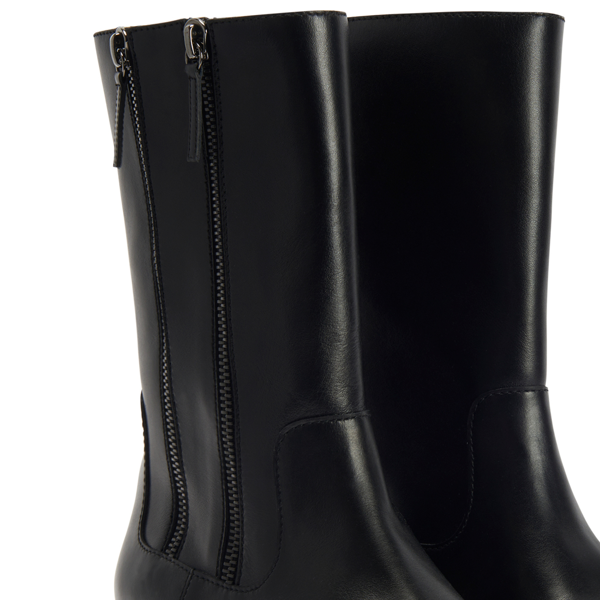 Leather calf-length boots with two outer zips and one-piece sole.