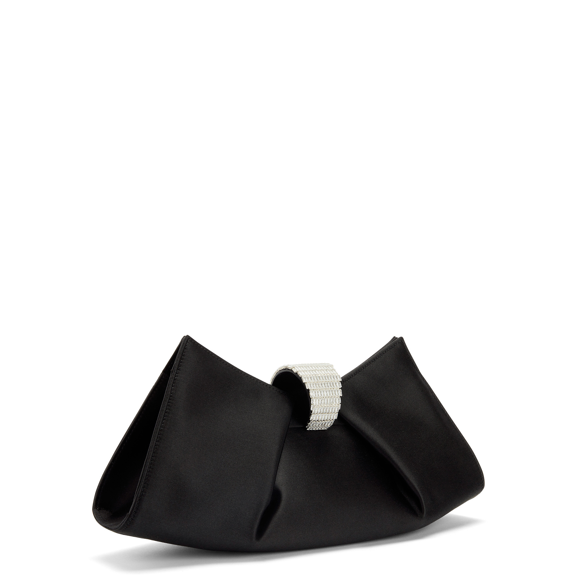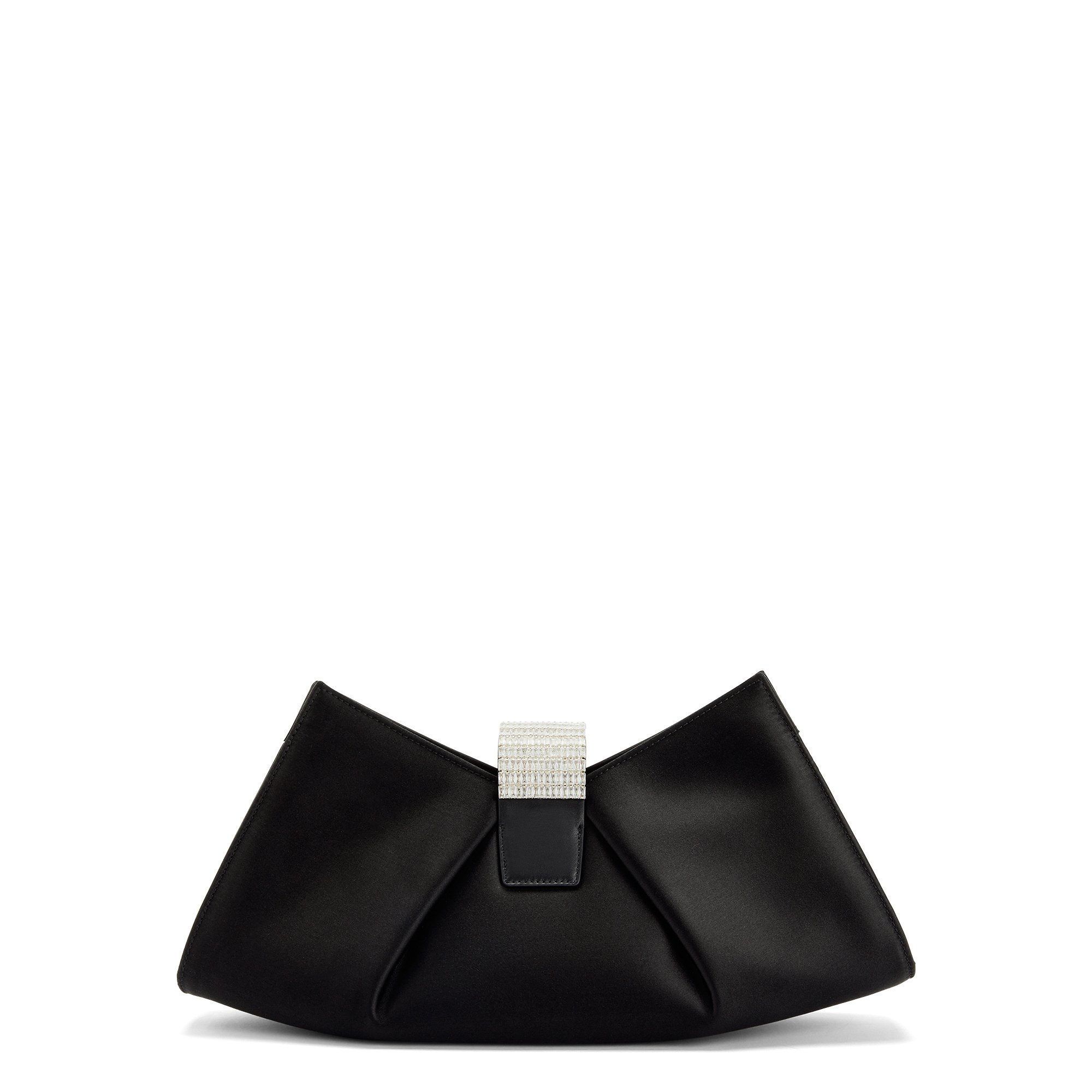 Satin clutch with baguette crystal embellishment and an inside card slot.