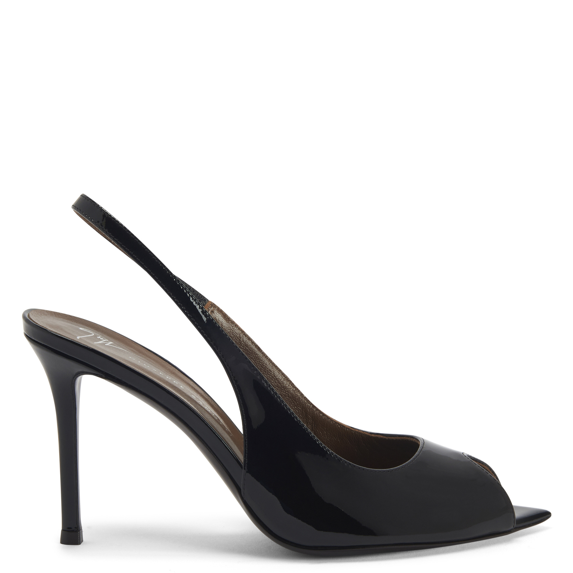 Open-toe slingback sandals in laminated leather with geometric topline, pointed insole and stiletto heel.