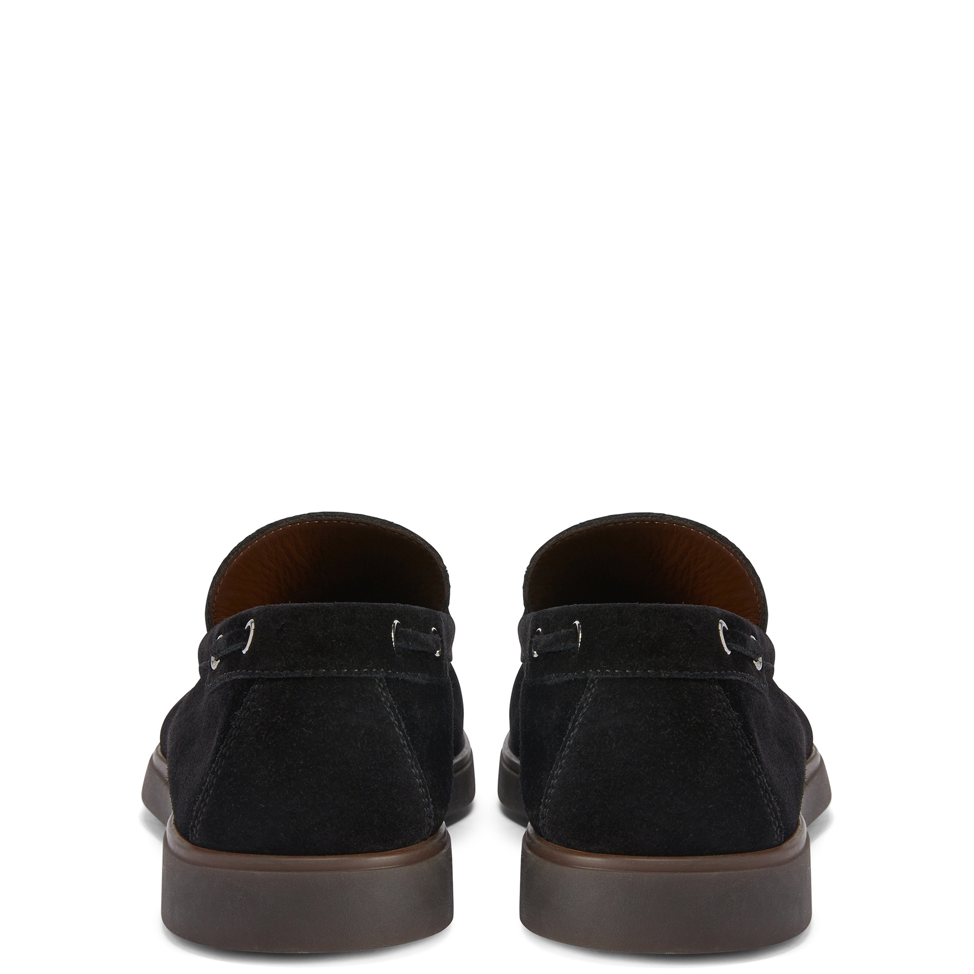 Unlined suede moccasins with threading, metal Signature detail on the tongue and rubber sole.