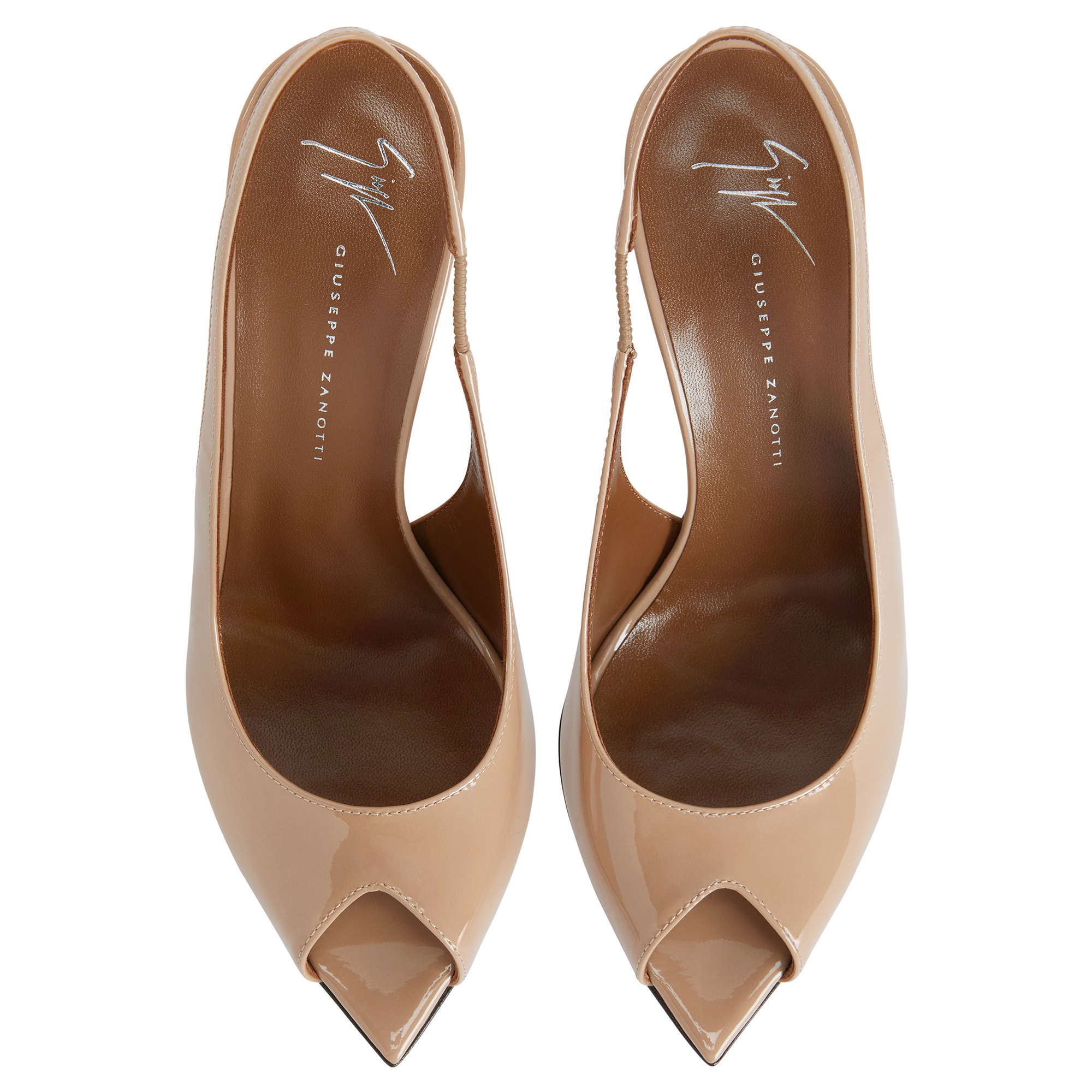 Open-toe slingback sandals in patent leather with geometric topline, pointed insole and stiletto heel.